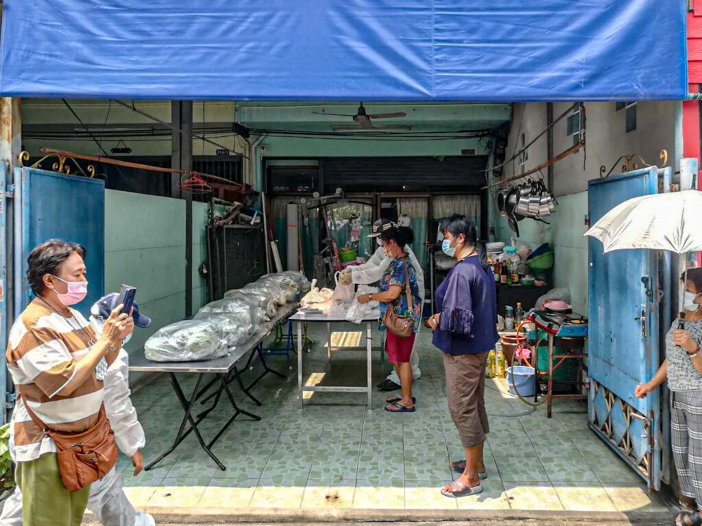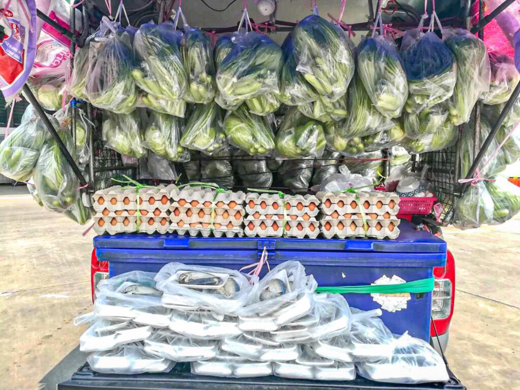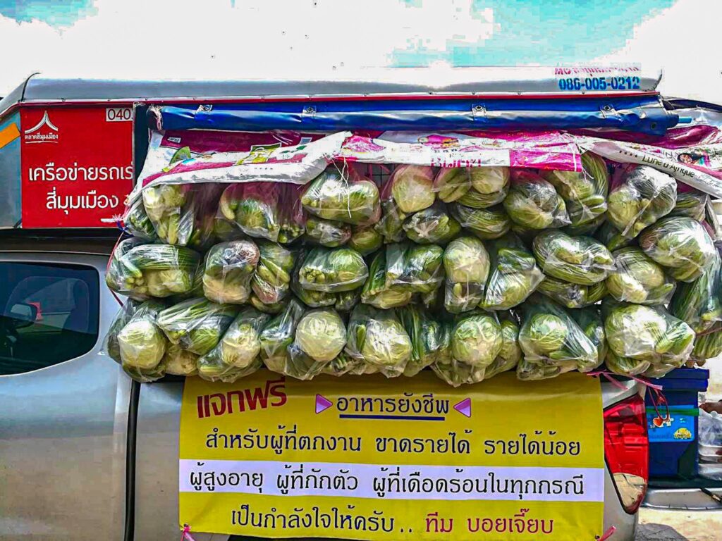 บอย อนุวัฒน์ และ เจี๊ยบ พิจิตตรา กล่าวว่า สำหรับที่มาของไอเดียของรถกับข้าวนี้ เริ่มจากช่วงโควิดครั้งที่แล้วทางเจี๊ยบ บอย และทีมงานที่ร้านทำอาหารแจก จนโควิดครั้งนี้ คนที่ได้รับแจกไปส่งข้อความมาถามโทรมาที่ร้านว่ามีการแจกไหม แจกวันไหนบ้างเราทั้งคู่เลยมานั่งคิดดูถ้าเราแจกครั้งนี้ อยากให้เป็นกระบวนการที่ไปส่งถึงบ้านเลยเพราะว่าโซนที่เราอยู่ค่อนข้างไกลเหมือนกันคนที่มารับอาหารคือต้องนั่งรถมาไกลเหมือนกัน แล้วจำนวนคนที่ได้รับก็ไม่ค่อยทั่วถึงแล้วครั้งที่แล้วเราแจกเป็นอาหารกล่องแล้วทานได้มื้อเดียว ครั้งนี้เราเลยคิดว่าเราอยากถ้าเป็นรถพุ่มพวงไปส่งถึงตามแต่ละชุมชนที่เดือดร้อนน่าจะเข้าถึงแล้วก็ 1 ชุดที่เราจัดไปน่าจะได้สักประมาณ 3 – 4 มื้อ เราอยากให้อาหารไปถึงมือจริงๆแล้วอยากให้ได้ทานกันทั้งครอบครัว เรามองว่าอาหารเป็นสิ่งที่สำคัญที่สุด กองทัพต้องเดินด้วยท้องเพราะฉะนั้น พอท้องอิ่มก็จะทำให้เรามีแรงมีกำลังที่จะลุกขึ้นสู้วิธีการหารายได้ของแต่ละคน เราทั้งคู่เลยส่งกำลังใจไปในรูปแบบของอาหาร ซี่งครั้งแรกที่เราได้เห็นภาพรถที่ออกไปทีมงานส่งคลิปมาคือ น้ำตาคลอเลย ซึ่งทุกคนก็เข้าใจกฎระเบียบกติกาที่เราขอความร่วมมือเป็นอย่างดี ทุกคนใส่แมส ทุกคนยืนเว้นระยะห่าง และเจ้าหน้าที่อาสาสมัครของแต่ละชุมชนเขามาช่วยเหลือเรามาจัดระเบียบ ทำให้การที่เราไปแจกแต่ละครั้งแจกด้วยความรวดเร็วเพราะทุกคนมีความเป็นระเบียบ ซึ่งความตั้งใจของเราคือ แจกให้เร็วที่สุดและให้จำนวนคนที่รับได้รับมากที่สุดให้ทั่วถึงทุกบ้านอย่างเต็มที่ค่ะ ซึ่งเราก็รู้สึกดีใจที่ได้เห็นภาพนั้นออกมาเพราะวันนี้ เย็นนี้ เขามีอาหารทานแล้ว ก็อยากจะฝากกำลังใจไปให้กับทุกๆคน ทุกๆครอบครัว ที่กำลังประสบปัญหานี้ มากน้อยก็ตามแต่ที่ทุกจะเจอ ผมเชื่อว่าทุกคนมีทางออกและผมเชื่อว่าคนไทยพวกเราไม่เคยทิ้งกัน และ เราก็จะไม่ทอดทิ้งกันมีอีกหลายๆครอบครัวที่พร้อมจะหยิบยื่นน้ำใจตรงนี้ อย่าท้อนะครับ ในฐานะที่พวกเรากำลังจัดเตรียมรถกับข้าวก็จะพยายามทำหน้าที่นี้ หน้าที่เล็กๆของเราให้ดีที่สุดและได้ช่วยหลายๆชุมชนให้ได้มากที่สุด เป็นกำลังใจให้นะคะ “