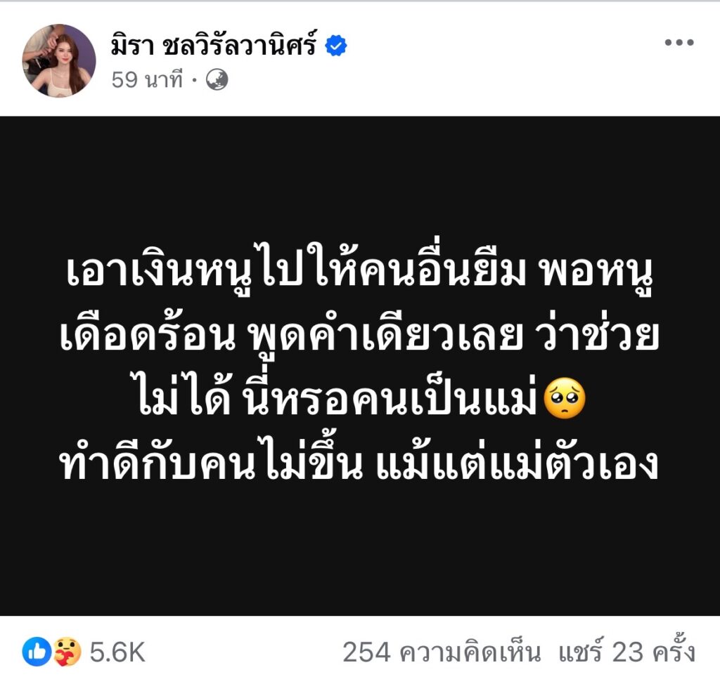 เรียกว่าทำเอาโซเชียลขนลุกไม่ไหว เมื่อทางด้านนักร้องสาว “เอ๋ มิรา” ได้ออกมาฟาดเดือดถึงคุณแม่ขอตัดขาดความเป็นแม่เป็นลูก โดยออกมาโพสต์ข้อความว่า “ไม่เคยคิดว่ามันจะเกิดขึ้นกับเรา ตั้งแต่วันนี้ไป เราขอตัดขาดความเป็นแม่เป็นลูก กับผู้หญิงที่เรารักและเรียกว่าแม่ เราไม่ไหวและไม่อยากรับรู้เรื่องราวอะไรอีกแล้ว พอกันที แม่จะทำอะไรก็เรื่องของแม่เลย”