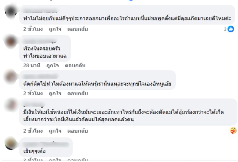 ท่ามกลางชาวเน็ตเข้ามาส่งกำลังใจให้ แต่ก็มีบางกลุ่มมองว่าเรื่องแบบนี้เป็นเรื่องครอบครัวไม่ควรเอาออกมาพูด อาทิ “ตัดไม่ตัดหรือยังไงก็ไม่กล้าพูดให้คนอื่นได้รับรู้เรื่องคนในครอบครัวความคิดเรานะ , โลกเราเปลี่ยนไปเยอะทุกวันนี้มีแต่ลูกตัดแม่สมัยก่อนมีแต่แม่ตัดลูกลูกทุกวันนี้ไม่มีความอดทนแม่ก็คือแม่ถึงจะเป้นแบบใหน่เราก็แค่อยู่เฉยๆต่างคนต่างอยู่ไม่ต้องออกประกาสให้โลกรู้ก็ใด้ว่าแม่ไม่ดีเราเป้นลูกเราดีแค่ใหน่ถึงแม่จะไม่ดีขนาดใหน่ก็ไม่ต้องมาประจานแม่ตัวเองแค่เราไม่ต้องยุ่งกันกะแม่ก็คงพอมัง , สาวไส้ให้กากิน เรื่องครอบครัวไม่ควรเอามาเปิดเผยหรอก ดารานักร้องสมัยนี้เขาเปิดกันน่าดู