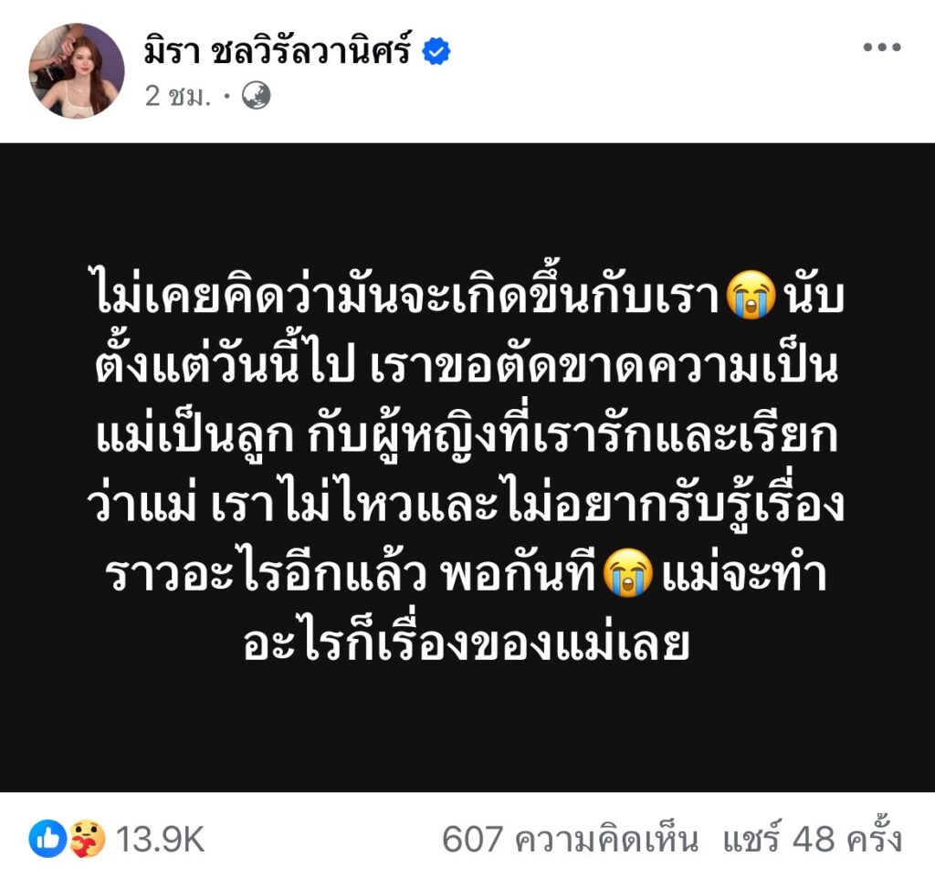 เรียกว่าทำเอาโซเชียลขนลุกไม่ไหว เมื่อทางด้านนักร้องสาว “เอ๋ มิรา” ได้ออกมาฟาดเดือดถึงคุณแม่ขอตัดขาดความเป็นแม่เป็นลูก โดยออกมาโพสต์ข้อความว่า “ไม่เคยคิดว่ามันจะเกิดขึ้นกับเรา ตั้งแต่วันนี้ไป เราขอตัดขาดความเป็นแม่เป็นลูก กับผู้หญิงที่เรารักและเรียกว่าแม่ เราไม่ไหวและไม่อยากรับรู้เรื่องราวอะไรอีกแล้ว พอกันที แม่จะทำอะไรก็เรื่องของแม่เลย”