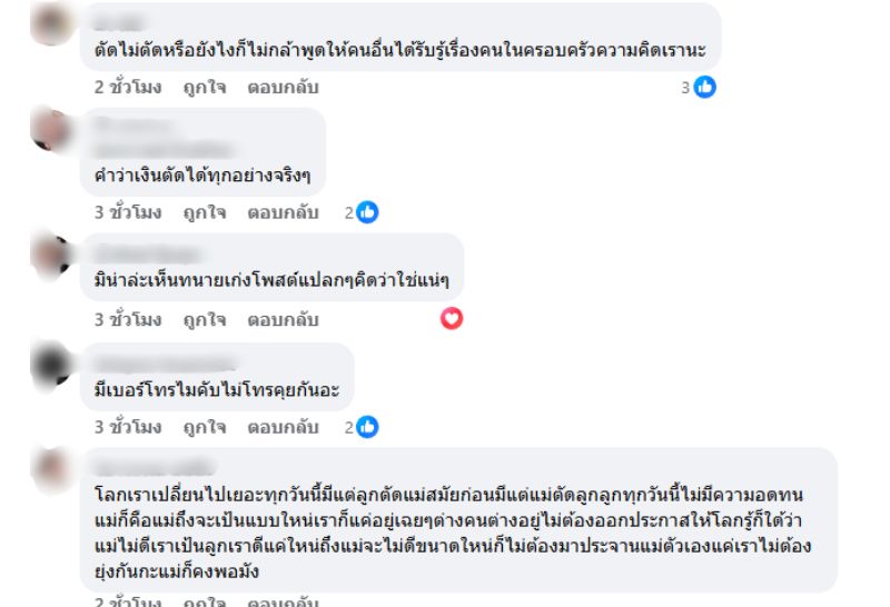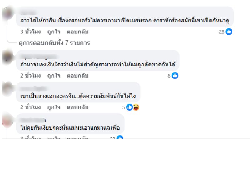 ท่ามกลางชาวเน็ตเข้ามาส่งกำลังใจให้ แต่ก็มีบางกลุ่มมองว่าเรื่องแบบนี้เป็นเรื่องครอบครัวไม่ควรเอาออกมาพูด อาทิ “ตัดไม่ตัดหรือยังไงก็ไม่กล้าพูดให้คนอื่นได้รับรู้เรื่องคนในครอบครัวความคิดเรานะ , โลกเราเปลี่ยนไปเยอะทุกวันนี้มีแต่ลูกตัดแม่สมัยก่อนมีแต่แม่ตัดลูกลูกทุกวันนี้ไม่มีความอดทนแม่ก็คือแม่ถึงจะเป้นแบบใหน่เราก็แค่อยู่เฉยๆต่างคนต่างอยู่ไม่ต้องออกประกาสให้โลกรู้ก็ใด้ว่าแม่ไม่ดีเราเป้นลูกเราดีแค่ใหน่ถึงแม่จะไม่ดีขนาดใหน่ก็ไม่ต้องมาประจานแม่ตัวเองแค่เราไม่ต้องยุ่งกันกะแม่ก็คงพอมัง , สาวไส้ให้กากิน เรื่องครอบครัวไม่ควรเอามาเปิดเผยหรอก ดารานักร้องสมัยนี้เขาเปิดกันน่าดู