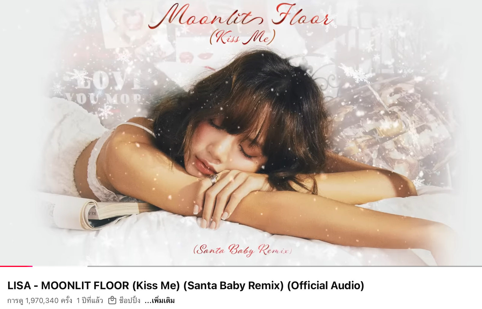 - LISA – Moonlit Floor (Kiss Me) (Santa Baby Remix) เพลงนี้มีธีมเข้ากับเทศกาลคริสต์มาสและปีใหม่ ด้วยจังหวะและเนื้อเพลงที่อบอุ่น สนุกสนาน เหมาะมากกับการเปิดในงานปีใหม่หรือช่วงค่ำคืนที่เต็มไปด้วยความสุข