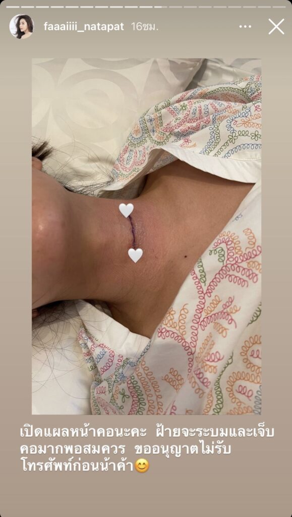 “วันนี้มาอัพเดตอาการค่า เพราะมีหลายๆท่านสงสัยว่าฝ้ายเป็นอะไร ไม่ได้รับสายหรือตอบพี่ๆนักข่าวเลยเนื่องจากยังพูดไม่สะดวกนะคะ ฝ้ายเป็นหมอนรองกระดูกทับเส้นประสาทมาสองปีกว่าๆแล้วค่ะ ทำให้มีอาการชาและกล้ามเนื้ออ่อนแรง ที่ผ่านมาพยายามดูแลตัวเองและระมัดระวังในการใช้ชีวิตมาตลอด มีบ้างที่ลืมตัวเวลาทำงานค่ะ🤣แต่เนื่องจากก่อนหน้านี้ไม่นานฝ้ายตกบันได ศรีษะฟาดซ้ำไปอีก เลยทำให้อาการทรุดลง กล้ามเนื้ออ่อนแรง เขียนหนังสือก็ไม่ได้ คุณหมอพิจารณาแล้วว่าไม่ได้แล้ว ไม่อย่างนั้นจะแย่กว่านี้ เลยได้ทำการผ่าตัดรักษาให้ฝ้ายเรียบร้อยค่ะ กราบขอบพระคุณ คุณหมอวิชาญ ยิ่งศักดิ์มงคล ที่น่ารักกับฝ้ายอย่างที่สุด และทีมแพทย์ร่วมผ่าตัดอีก 3 ท่าน พี่นก พี่แหม่ม ที่คอยดูแลตลอด รวมถึงพี่ๆพยาบาล ของ รพ. BNH ด้วยนะคะ และครอบครัวสุดที่รัก แม่ พี่ตาม นอร์จ เพื่อนๆพี่ๆทุกคน ที่เป็นห่วงฝ้ายนะคะ^^ #สุขภาพดีคือดีที่สุด #จ่ายเงินเองประกันไม่เกี่ยว🤣”