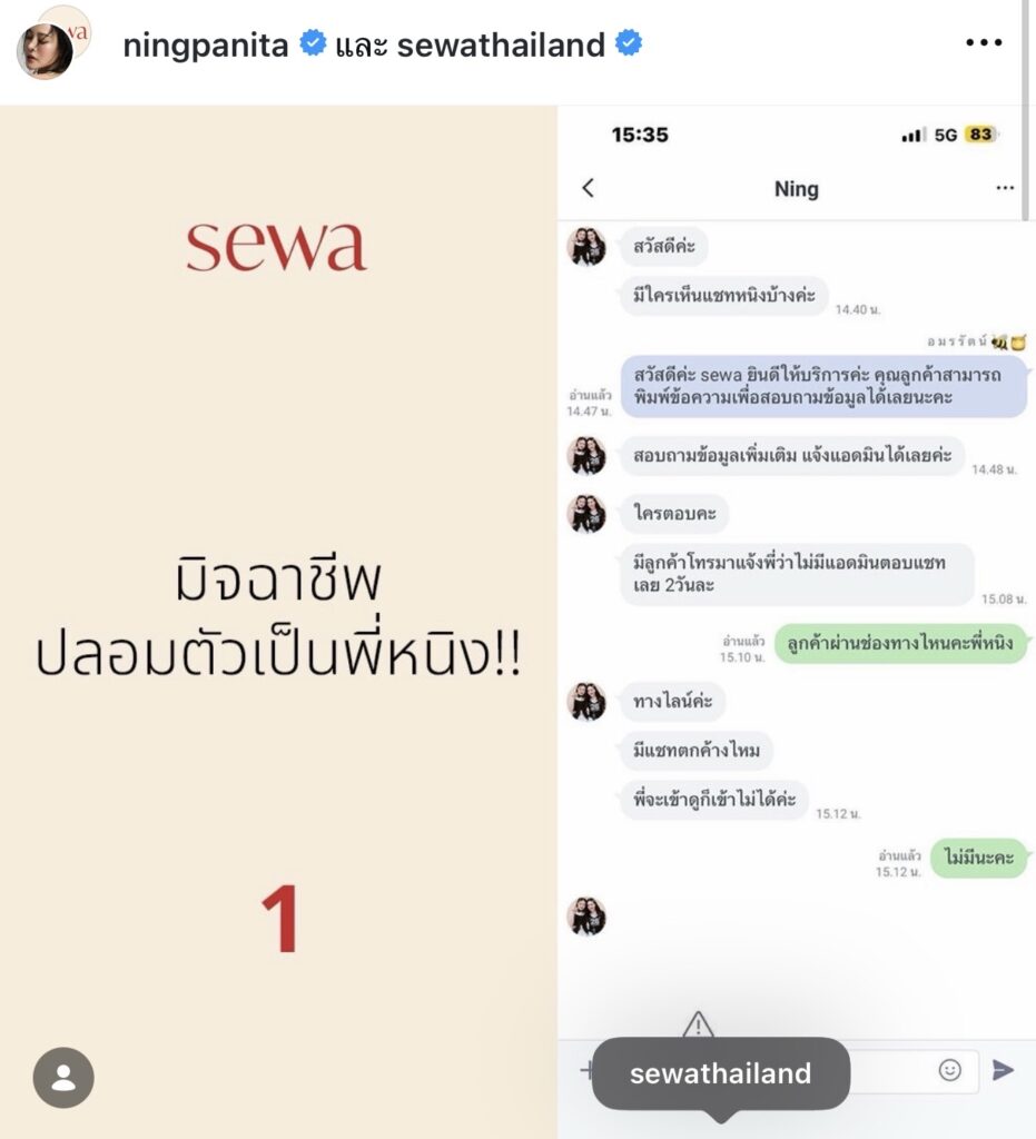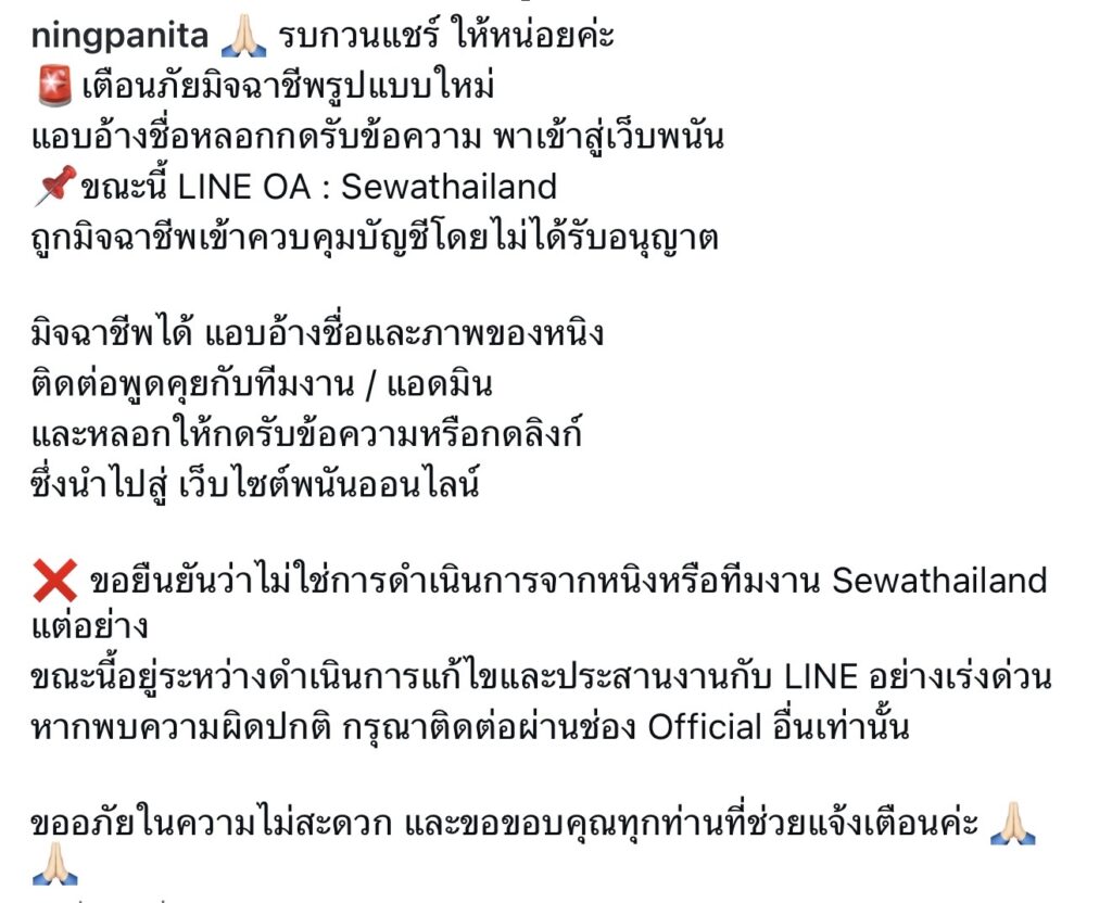 โดย ‘หนิง ปณิตา’ ก็ได้ออกมาโพสต์เคลื่อนไหวและขอความช่วยเหลือ ระบุว่า ขณะนี้ LINE OA ชื่อ Sewathailand ถูกผู้ไม่หวังดีเข้าควบคุมบัญชีโดยไม่ได้รับอนุญาต และถูกนำไปใช้เป็นเครื่องมือหลอกลวงประชาชน พร้อมยืนยันชัดเจนว่า ไม่ใช่การดำเนินงานจากตัวหนิงหรือทีมงาน Sewathailand แต่อย่างใด