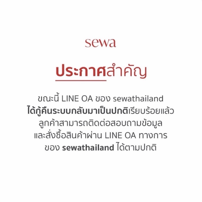 📌 ขณะนี้ LINE OA ของ sewathailand ได้กู้คืนระบบกลับมาเป็นปกติเรียบร้อยแล้ว