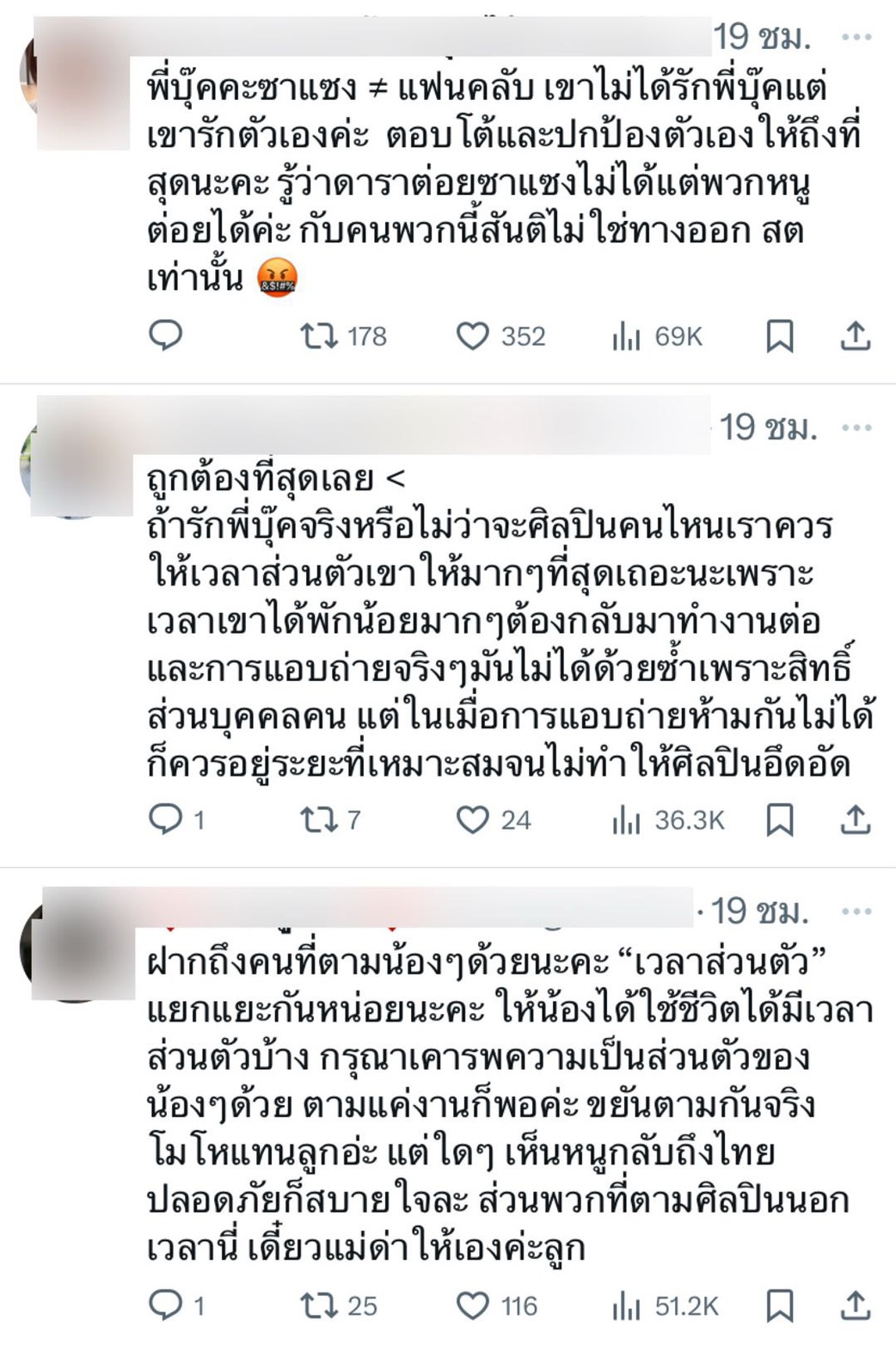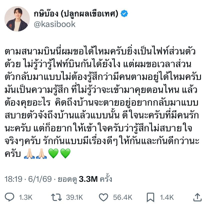 โดยทางด้านหนุ่ม “บุ๊ค” ได้โพสต์ข้อความเดือดผ่านบัญชี X ส่วนตัว เล่าถึงเหตุการณ์ที่เกิดขึ้นว่า “ตามสนามบินนี่ผมขอได้ไหมครับยิ่งเป็นไฟท์ส่วนตัวด้วย ไม่รู้ว่ารู้ไฟท์บินกันได้ยังไง แต่ผมขอเวลาส่วนตัวกลับมาแบบไม่ต้องรู้สึกว่ามีคนตามอยู่ได้ไหมครับ มันเป็นความรู้สึก ที่ไม่รู้ว่าจะเข้ามาคุยตอนไหน แล้วต้องคุยอะไร คิดถึงบ้านจะตายอยู่อยากกลับมาแบบสบายตัวจังถึงบ้านแล้วแบบนั้น ดีใจนะครับที่มีคนรักนะครับ แต่ก็อยากให้เข้าใจครับว่ารู้สึกไม่สบายใจจริงๆ ครับ รักกันแบบมีเรื่องดีๆ ให้กันและกันดีกว่านะครับ”