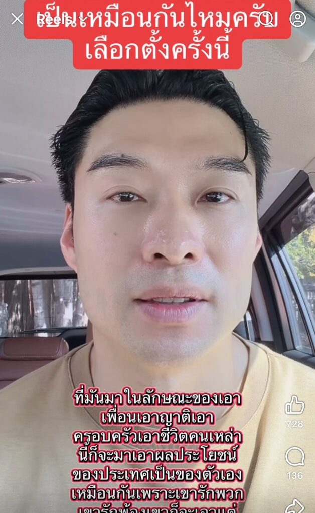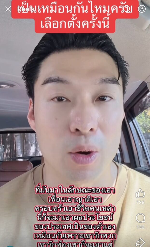 พร้อมเขียนแคปชั่นว่า “เลือกประเทศไทย อย่าเลือกแค่คน เพราะประเทศพังเพราะคนมาเยอะแล้ว… เพื่อนเอาเพื่อนมาทำงาน ญาติเอาญาติมาทำงาน ครอบครัวเอาครอบครัวมาทำงาน สุดท้ายก็ทำเพื่อเพื่อน เพื่อญาติ เพื่อครอบครัว แต่!!!ไม่ได้ทำเพื่อประเทศไทยเลย… ประเทศไทยในมือคุณ #เลือกตั้ง #เลือกประเทศไทย #อย่าเลือกคน #อย่ายอมให้เงินซื้อใคร #ประเทศไทยต้องเจริญ”