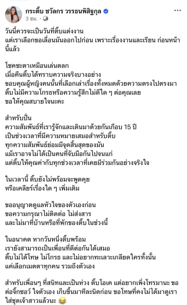 สำหรับเพื่อนๆ ที่สนิทและเป็นห่วง ติ๊บโอเค แต่อยากเพิ่งโทรมานะ ขอต่อจิ๊กซอว์ ใจตัวเอง เก็บขึ้นมาทีละนิดก่อน ขอโทษที่คงไม่ได้มาดูเราใส่ชุดเจ้าสาวแล้วนะ 😂“