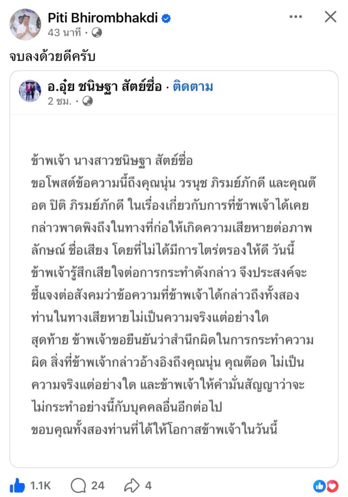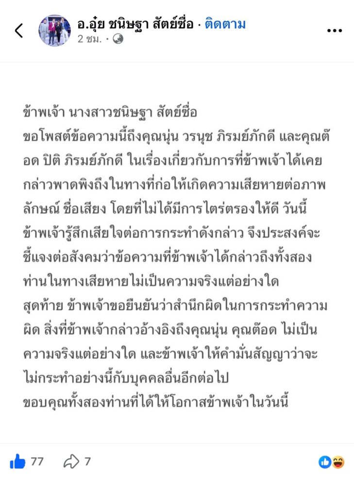 ล่าสุดทางด้าน “อ.อุ๋ย” ได้ออกมาโพสต์ข้อความขอโทษถึงประเด็นดังกล่าว พร้อมรับว่าตนโกหก “ข้าพเจ้า นางสาวชนิษฐา สัตย์ซื่อขอโพสต์ข้อความนี้ถึงคุณนุ่น วรนุช ภิรมย์ภักดี และคุณต๊อด ปิติ ภิรมย์ภักดี ในเรื่องเกี่ยวกับการที่ข้าพเจ้าได้เคยกล่าวพาดพิงถึงในทางที่ก่อให้เกิดความเสียหายต่อภาพ ลักษณ์ ชื่อเสียง โดยที่ไม่ได้มีการไตร่ตรองให้ดี วันนี้ข้าพเจ้ารู้สึกเสียใจต่อการกระทำดังกล่าว จึงประสงค์จะ ชี้แจงต่อสังคมว่าข้อความที่ข้าพเจ้าได้กล่าวถึงทั้งสอง ท่านในทางเสียหายไม่เป็นความจริงแต่อย่างใด สุดท้าย ข้าพเจ้าขอยืนยันว่าสำนึกผิดในการกระทำความผิด สิ่งที่ข้าพเจ้ากล่าวอ้างอิงถึงคุณนุ่น คุณต๊อด ไม่เป็นความจริงแต่อย่างใด และข้าพเจ้าให้คำมั่นสัญญาว่าจะไม่กระทำอย่างนี้กับบุคคลอื่นอีกต่อไป ขอบคุณทั้งสองท่านที่ได้ให้โอกาสข้าพเจ้าในวันนี้“