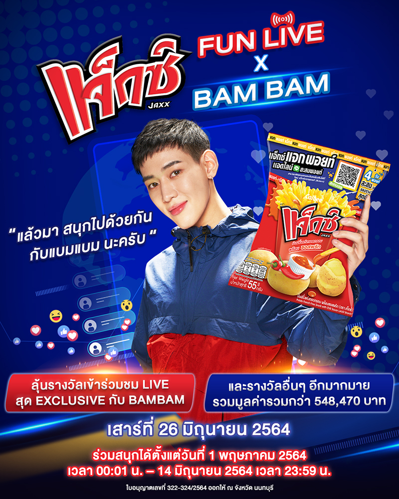 จัดเต็มความสนุก แบบเต็มที่อย่างแน่นอน สำหรับกิจกรรม “แจ็กซ์ FUN LIVE x BAMBAM” (แจ็กซ์ ฟัน ไลฟ์ เอ็กซ์ แบมแบม) ที่ทุกคนสามารถมาร่วมสนุกได้ง่ายๆ และยังลุ้นเป็นผู้โชคดีได้ใกล้ชิด กับ แบมแบม มากกว่าใคร กับช่วงโมเมนต์สุดพิเศษใน แจ็กซ์ Call 1:1 กับ BAMBAM ผ่านการพูดคุยผ่านระบบ วิดีโอคอล เป็นเวลา 2 นาที ให้ได้เก็บความสุข ความประทับใจกันอย่างเต็มที่ นอกจากนี้ยังมีรางวัลสุดพิเศษที่ทาง แจ็กซ์ และ แบมแบม จะนำมามอบให้ผู้โชคดีอีกด้วย ขอย้ำของรางวัลมีจำนวนจำกัด!!!!