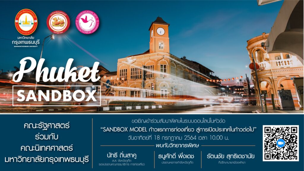 คณะรัฐศาสตร์ ร่วมกับ คณะนิเทศศาสตร์ มหาวิทยาลัยกรุงเทพธนบุรี ร่วมกันจัดสัมมนาพิเศษในระบบออนไลน์ (ZOOM) ในหัวข้อ “SANDBOX MODEL ก้าวแรกการท่องเที่ยว สู่การเปิดประเทศในก้าวต่อไป” โดยวิทยากรผู้ทรงคุณวุฒิ คุณนัทธี ถิ่นสาคู สมาชิกสภาผู้แทนราษฎร จังหวัดภูเก็ต และ รองประธานคณะกรรมาธิการ การท่องเที่ยว, คุณธนูศักดิ์ พึ่งเดช ประธานหอการค้าจังหวัดภูเก็ต และคุณรัตนชัย สุทธิเดชานัย ที่ปรึกษานายกเมืองพัทยา ดำเนินรายการโดย รศ.ดร.กมลพร กัลยาณมิตร คณบดีคณะรัฐศาสตร์ และ รศ.ดร.สุกัญญา บูรณเดชาชัย คณบดีคณะนิเทศศาสตร์ มหาวิทยาลัยกรุงเทพธนบุรี โดยมี ธนภณ โอภาสธัญกร (ต้อม นิรันดร์) และ แอปเปิ้ล-กิรษา หอมเสียง เป็นพิธีกร ในวันอาทิตย์ที่ 18 กรกฎาคม 2564 ตั้งแต่เวลา 10.00 น. เป็นต้นไป