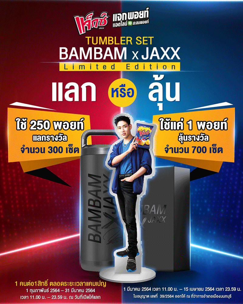 สำหรับกิจกรรมนี้ ทุกคนสามารถร่วมสนุกได้เพียงแค่ Add Line @Jaxx หรือสแกน QR Code บนหน้าซองผลิตภัณฑ์เพื่อเพิ่มเพื่อน แจ็กซ์แจกพอยท์ แล้วมาร่วมสนุก รับ Tumbler set BAMBAM x JAXX สุดพิเศษ!!!!นี้ไปครอบครอง ……. สินค้ามีจำนวนจำกัด สามารถร่วมสนุกได้ตั้งแต่วันนี้ – 15 เมษายน 2564 พร้อมติดตามความพิเศษที่ Jaxx จะนํามามอบให้ทุกคน หรือ รายละเอียดเพิ่มเติมได้ที่ Fan page FB Jaxx Mun Station https://www.facebook.com/jaxxmunstation