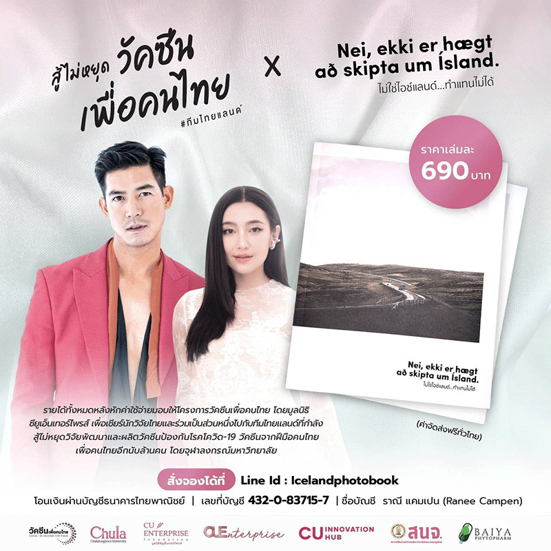 ด้าน เบลล่า-เวียร์ เราสองคนตั้งใจนำ ‘โฟโต้บุ๊กบันทึกการเดินทาง #ไม่ใช่ไอซ์แลนด์ทำแทนไม่ได้ มาจำหน่ายเพื่อนำรายได้ทั้งหมดหลังหักค่าใช้จ่ายมอบให้โครงการวัคซีนเพื่อคนไทย โดยมูลนิธิซียูเอ็นเทอร์ไพรส์ เพื่อเชียร์นักวิจัยไทยและร่วมเป็นส่วนหนึ่งไปกับทีมไทยแลนด์ที่กำลังสู้ไม่หยุดวิจัยพัฒนาและผลิตวัคซีนป้องกันโรคโควิด-19 วัคซีนจากฝีมือคนไทยเพื่อคนไทยอีกนับล้านคน โดยจุฬาลงกรณ์มหาวิทยาลัย’