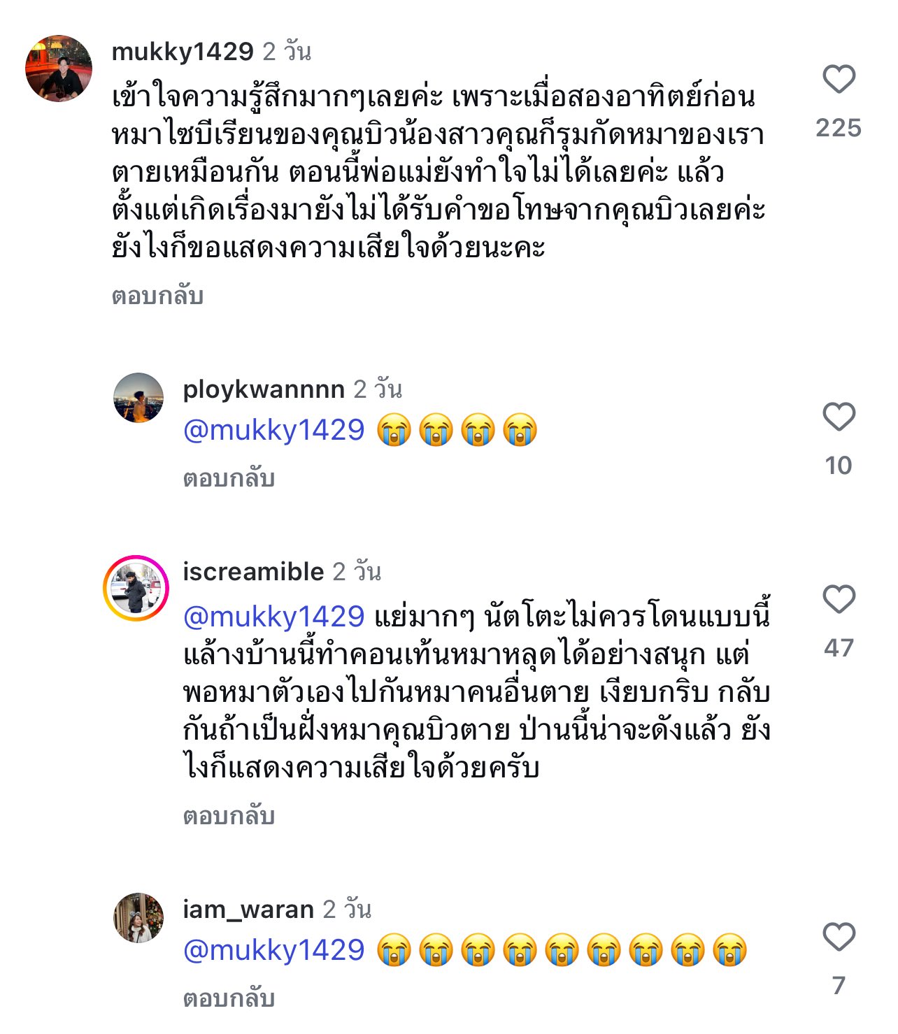 “เข้าใจความรู้สึกมากๆ เลยค่ะ เพราะเมื่อสองอาทิตย์ก่อนหมาไซบีเรียนของคุณบิวน้องสาวคุณก็รุมกัดหมาของเราตายเหมือนกัน ตั้งแต่เกิดเรื่องมายังไม่ได้รับคำขอโทษจากคุณบิวเลยค่ะ ยังไงก็ขอแสดงความเสียใจด้วยนะคะ”