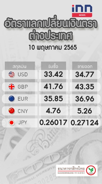 อัตราแลกเปลี่ยนเงินตราต่างประเทศของธนาคารกสิกรไทย เวลา 07.57 น. ดอลลาร์สหรัฐ รับซื้อ 33.42 บาท ขายออก 34.77 บาท