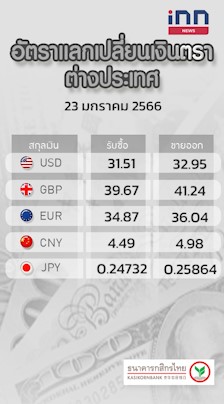 อัตราแลกเปลี่ยนเงินตราต่างประเทศ ของธนาคารกสิกรไทย เวลา 08.01 น. ดอลลาร์สหรัฐ รับซื้อ 31.51 บาท ขายออก 32.95บาท