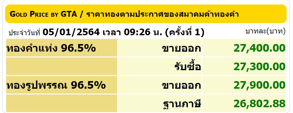 สมาคมค้าทองคำประกาศราคาซื้อ-ขายทอง ประจำวันอังคารที่ 5 มกราคม 2564 เมื่อเวลา 09.26 น. ซึ่งราคาปรับขึ้น 100 บาท เมื่อเทียบกับวานนี้ ราคาทองรูปพรรณ รับซื้อบาทละ 26,802.88 บาท ขายออกบาทละ 27,900.00 บาท ราคาทองคำแท่ง รับซื้อบาทละ 27,300.00 บาท ขายออกบาทละ 27,400.00 บาท