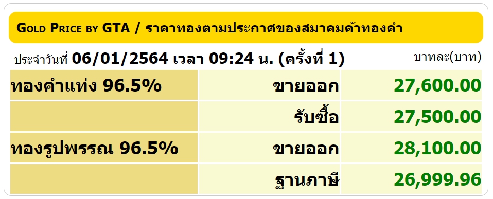 สมาคมค้าทองคำประกาศราคาซื้อ-ขายทอง ประจำวันพุธที่ 6 มกราคม 2564 เมื่อเวลา 09.24 น. ซึ่งราคาปรับขึ้น 50 บาท เมื่อเทียบกับวานนี้ ราคาทองรูปพรรณ รับซื้อบาทละ 26,999.96 บาท ขายออกบาทละ 28,100.00 บาท ราคาทองคำแท่ง รับซื้อบาทละ 27,500.00 บาท ขายออกบาทละ 27,600.00 บาท
