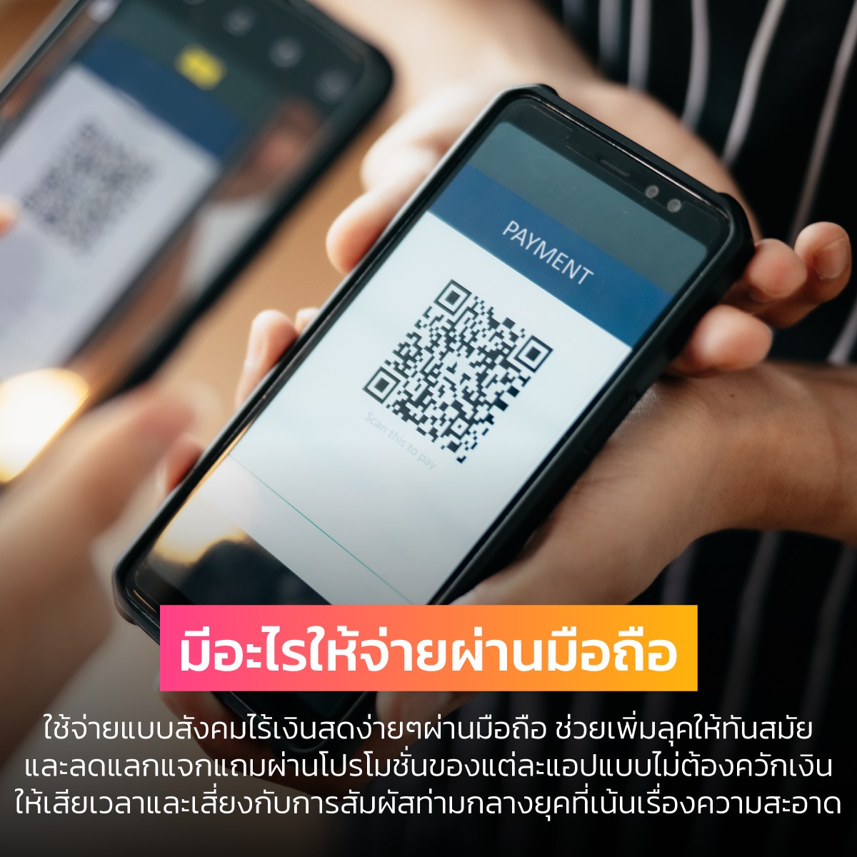 เมื่อโลกเข้าสู่ระบบดิจิทัล ทำไมเด็กออฟฟิศรุ่นใหม่อย่างเราต้องใช้วิธีการแบบเดิมๆ ลองหันมาใช้จ่ายแบบสังคมไร้เงินสดง่ายๆ ผ่านแอปฯบนมือถือ นอกจากช่วยเสริมลุคให้สมาร์ท ทันสมัย และไม่ต้องเสียเวลาควักเงินออกมานับแล้ว การจ่ายผ่านแอปฯยังมีโปรโมชั่นดีๆอีกด้วย ได้ทั้งส่วนลด ได้เครดิตเงินคืน แม้กระทั่งแต้มให้สะสมไว้แลกสินค้า ที่สำคัญยังช่วยลดความเสี่ยงจากการสัมผัสเงินด้วย QR Code ในยุคที่ต้องใส่ใจกับสุขภาพด้วยเหมือนกัน
