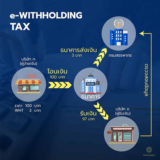e-withholding tax คือ การดำเนินการหักภาษี ณ ที่จ่าย และนำส่งผ่านเครือข่ายอิเล็กทรอนิกส์ของธนาคารผู้รับเงิน โดยกฎหมายจะกำหนดให้ผู้หักภาษี (ผู้จ่ายเงิน) ส่งข้อมูลการหักภาษี ณ ที่จ่ายของผู้รับเงิน พร้อมโอนเงินไปยังธนาคารที่ให้บริการ e-withholding tax  แล้วธนาคารจะมีหน้าที่เป็นตัวกลางโดยทำการดังนี้