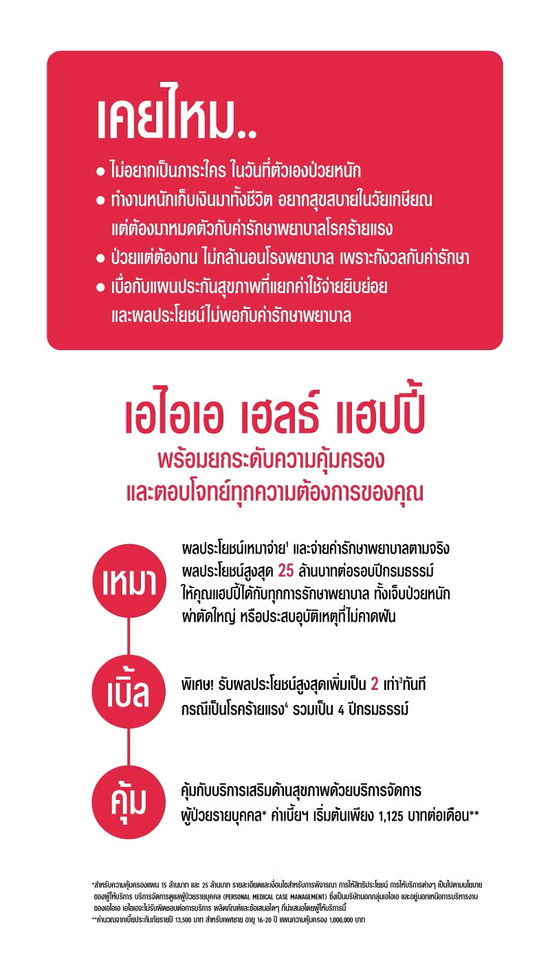 โรคมะเร็งและโรคหัวใจมักเกิดจากพฤติกรรมการใช้ชีวิต เช่น ความเครียด พักผ่อนน้อย หรือกินอาหารไม่สมดุล ค่ารักษาของโรคเหล่านี้อาจสูงถึงหลักล้าน แต่ด้วยแผน AIA Health Happy ที่จ่ายตามจริงและให้ผลประโยชน์เพิ่มขึ้น 2 เท่า ผู้เอาประกันจึงสามารถเข้ารับการรักษาได้อย่างเต็มรูปแบบโดยไม่ต้องห่วงค่าใช้จ่าย