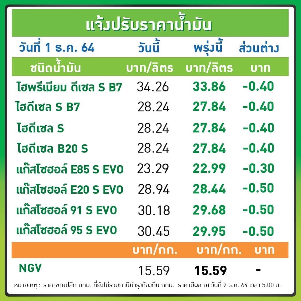 บมจ.ปตท.น้ำมันและการค้าปลีก (OR) และ บมจ.บางจาก คอร์ปอเรชั่น (BCP) ปรับลดราคาขายปลีกน้ำมันเบนซิน และแก๊สโซฮอล์ลงลิตรละ 50 สตางค์ เว้น E85 ลดลง 30 สตางค์ ส่วนดีเซล ลดลงลิตรละ 40 สตางค์ มีผลวันพรุ่งนี้ (2 ธ.ค.64) เวลา 05.00 น. เป็นต้นไป