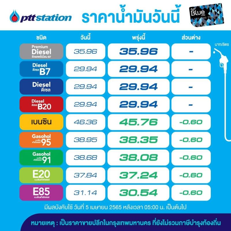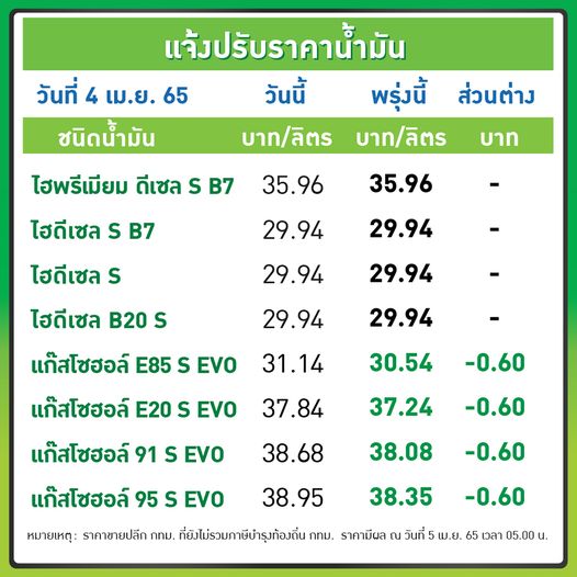 บมจ.ปตท.น้ำมันและการค้าปลีก (OR) และ บมจ.บางจาก คอร์ปอเรชั่น (BCP) ประกาศปรับลดราคาขายปลีกน้ำมันกลุ่มเบนซินและแก๊สโซฮอล์ทุกชนิด 60 สต.ต่อลิตร ส่วนกลุ่มดีเซลทุกชนิด คงเดิม มีผลพรุ่งนี้ 5 เม.ย. 2565 ตั้งแต่เวลา 05.00 น. เป็นต้นไป