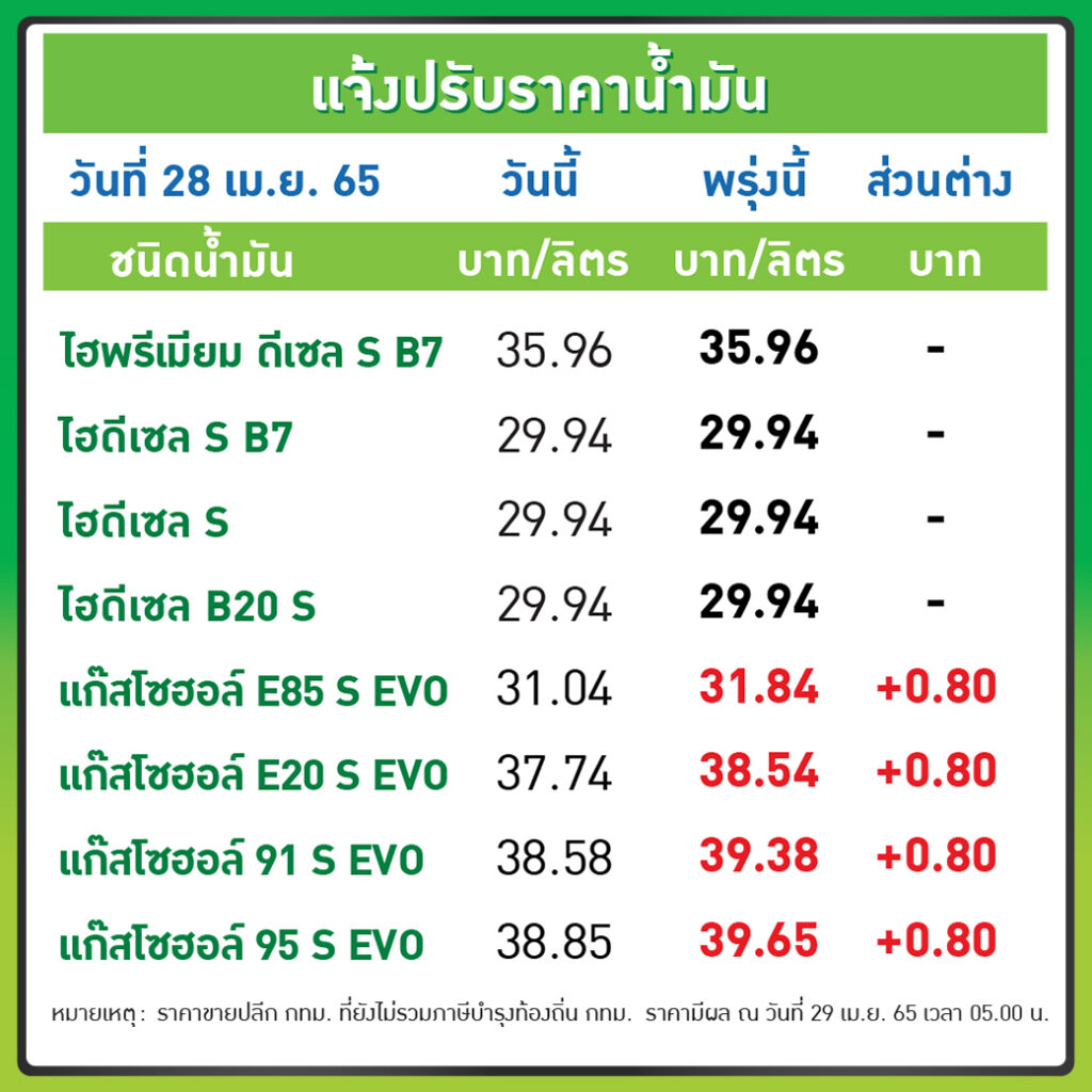 บมจ.ปตท.น้ำมันและการค้าปลีก (OR) และ บมจ.บางจาก คอร์ปอเรชั่น (BCP) ประกาศปรับขึ้นราคาขายปลีกน้ำมันกลุ่มเบนซินและแก๊สโซฮอล์ทุกชนิด 80 สต.ต่อลิตร ส่วนกลุ่มดีเซลทุกชนิดคงเดิม มีผลพรุ่งนี้ 29 เม.ย. 2565 ตั้งแต่เวลา 05.00 น. เป็นต้นไป