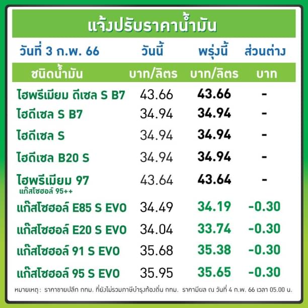 บริษัท ปตท.น้ำมันและการค้าปลีก จำกัด (มหาชน) (OR) และ บริษัท บางจาก คอร์ปอเรชั่น จำกัด (มหาชน) (BCP) ประกาศปรับลดราคาขายปลีกน้ำมันกลุ่มเบนซินและแก๊สโซฮอล์ทุกชนิด 30 ส.ต./ลิตร ส่วนกลุ่มดีเซลคงเดิม มีผล 4 ก.พ. 2566 ตั้งแต่เวลา 05.00 น. เป็นต้นไป