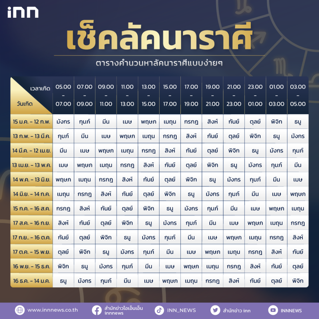 สำหรับใครที่อยากรู้ว่าตัวเองอยู่ลัคนาราศีอะไร สามารถเช็คได้ตามตารางนี้ได้เลย