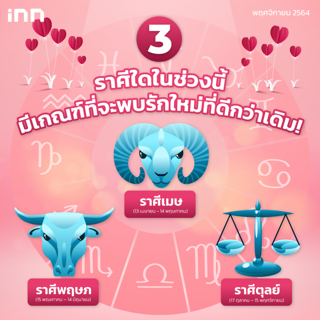 วันนี้ทีม iNN จะมาบอกข่าวดีสำหรับ 3 ราศีในช่วงเดือนพฤศจิกายนที่ดวงความรักจะพบรักใหม่ที่ดีกว่าเดิม! ว่าแต่จะมีราศีของคุณรวมอยู่ด้วยไหม ไปลุ้นพร้อมๆกันเลย!