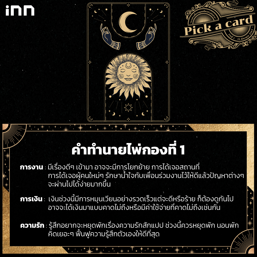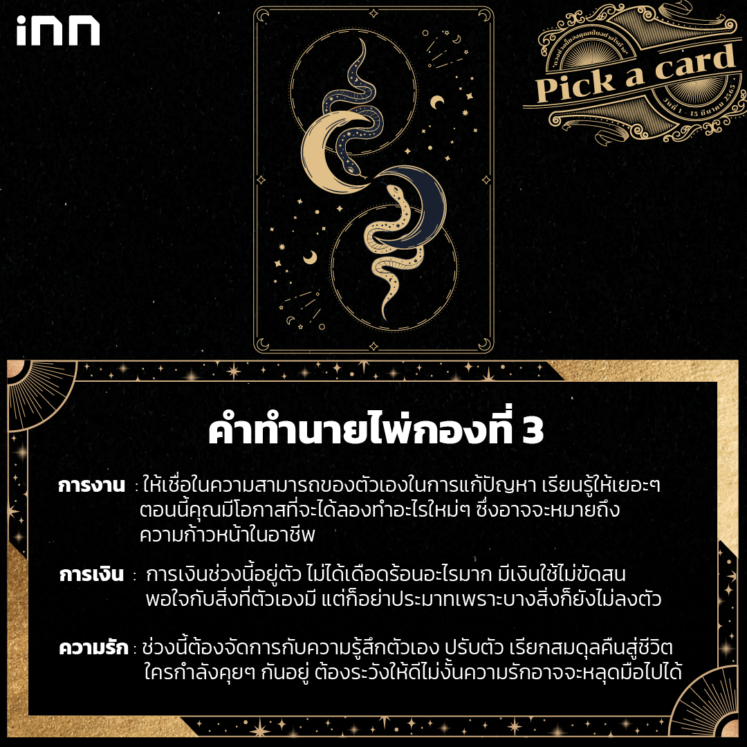 ไม่ว่าจะหยิบหรือเลือกกองไหน สำคัญที่สุดคือเตือนตัวเอง มีสติกับการใช้ชีวิต เพื่อที่จะผ่านเรื่องราวต่างๆ ในช่วงนี้ ถ้าใครที่มีความชอบในการอ่านดวง อยากเสริมดวง เสริมโชคลาภในรูปแบบอื่นๆ สามารถติดตามได้ที่นี่ iNN Horoscope