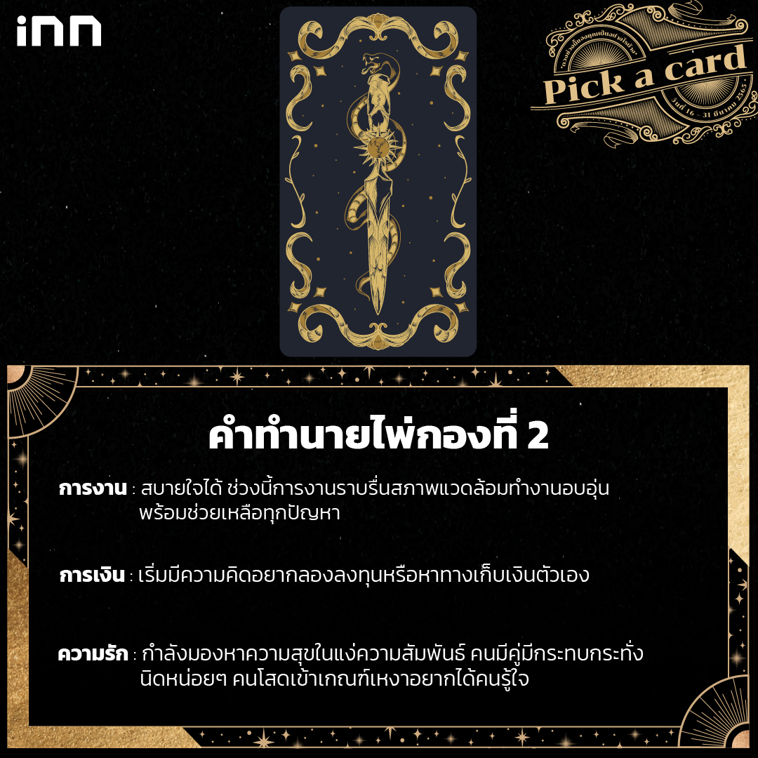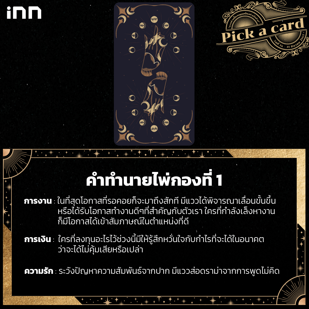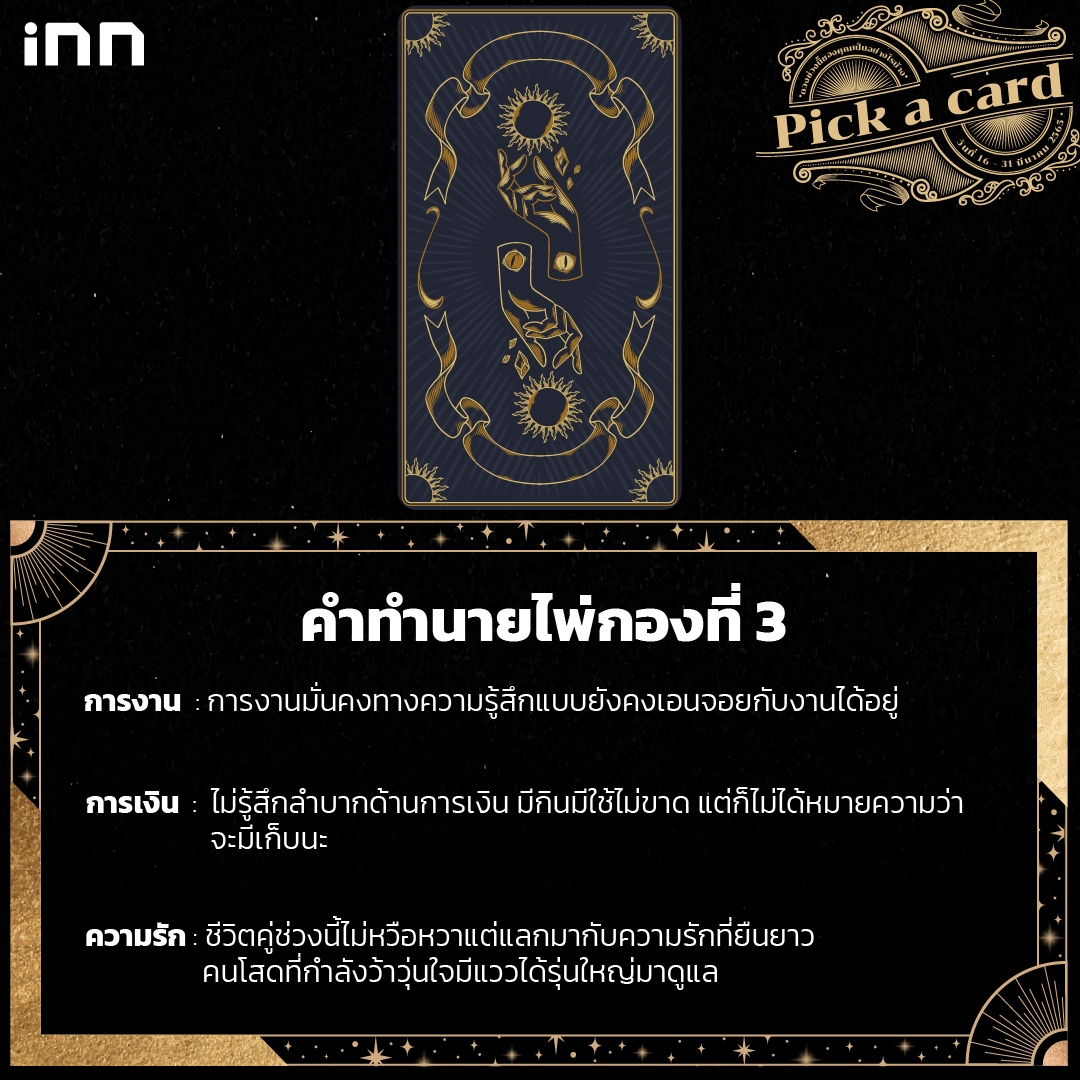 ไม่ว่าจะหยิบหรือเลือกกองไหน สำคัญที่สุดคือเตือนตัวเอง มีสติกับการใช้ชีวิต เพื่อที่จะผ่านเรื่องราวต่างๆ ในช่วงนี้ ถ้าใครที่มีความชอบในการอ่านดวง อยากเสริมดวง เสริมโชคลาภในรูปแบบอื่นๆ สามารถติดตามได้ที่นี่ iNN Horoscope