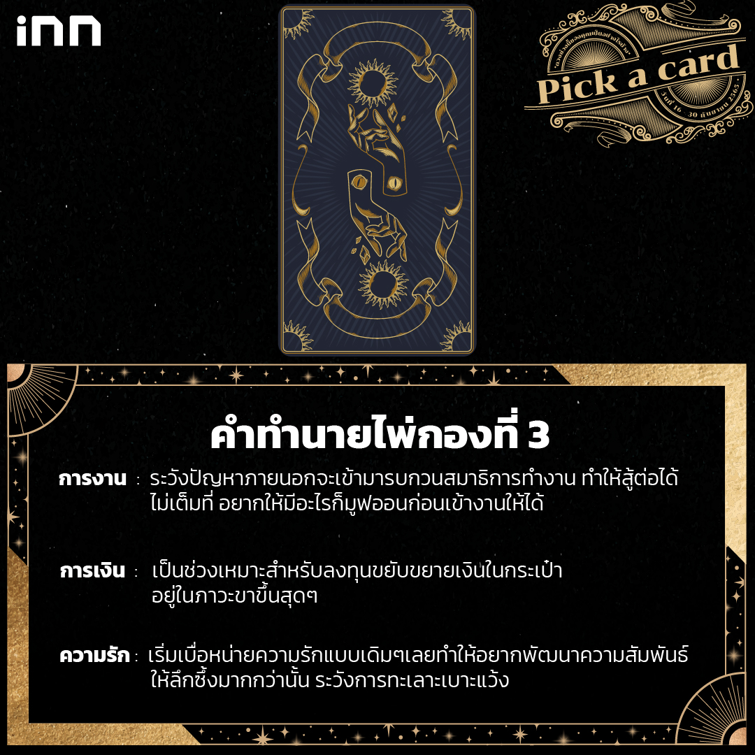 ไม่ว่าจะหยิบหรือเลือกกองไหน สำคัญที่สุดคือเตือนตัวเอง มีสติกับการใช้ชีวิต เพื่อที่จะผ่านเรื่องราวต่างๆ ในช่วงนี้ ถ้าใครที่มีความชอบในการอ่านดวง อยากเสริมดวง เสริมโชคลาภในรูปแบบอื่นๆ สามารถติดตามได้ที่นี่ iNN Horoscope