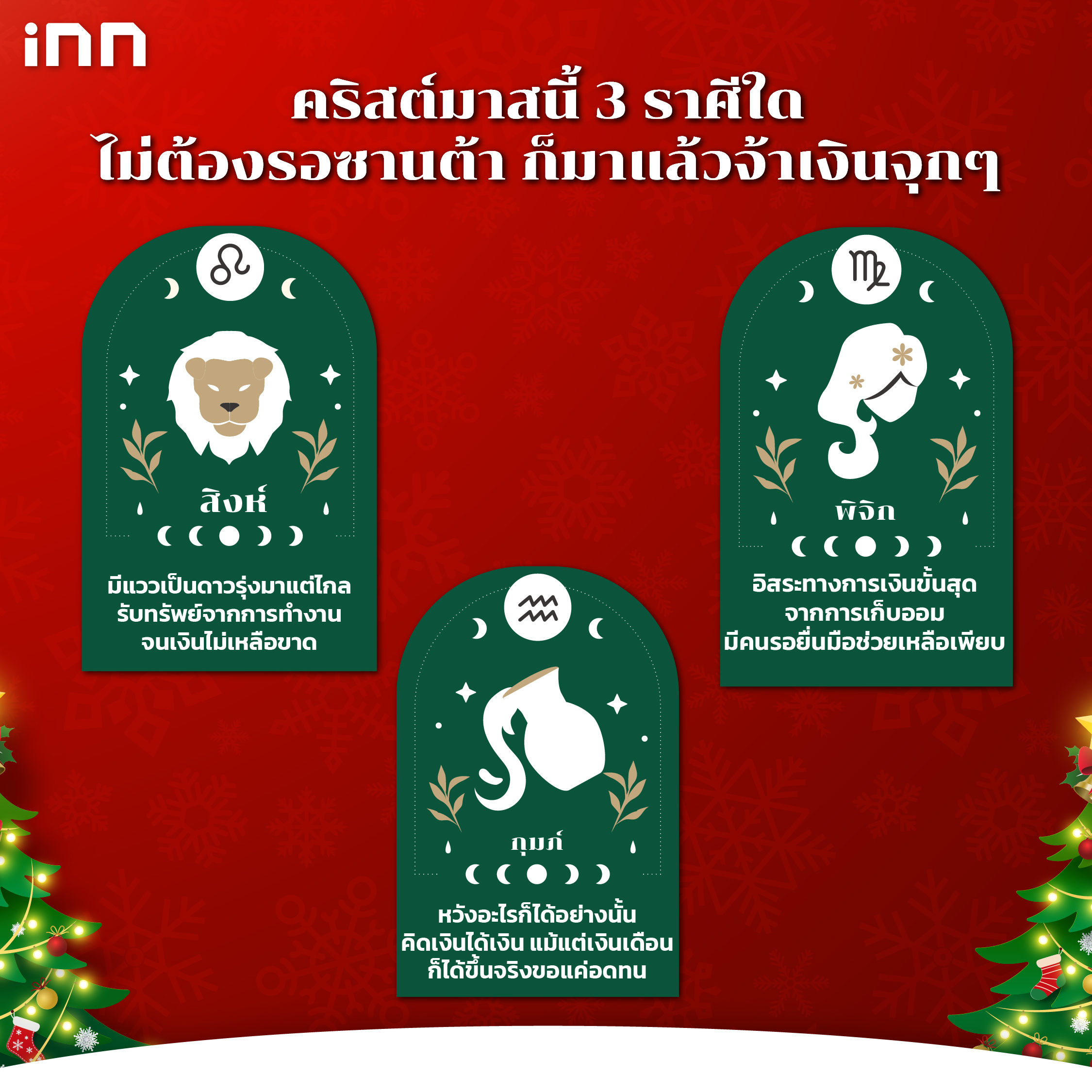 จบไปแล้วสำหรับ 3 ราศีการเงินปังรับเทศกาลคริสต์มาส ชาวราศีไหนไม่ติดโผก็อย่าเพิ่งน้อยใจไปนะ เพราะการเงินจะไม่ปังแต่ก็ไม่ถึงกับว่าแย่ เผลอๆดวงความรักเราอาจจะแซงล้ำหน้าไปเลยก็ได้ ส่วนใครที่หลงใหลในการมู แวะมาอ่านดวง เปิดไพ่กันต่อที่ iNN Horoscope ได้เลย