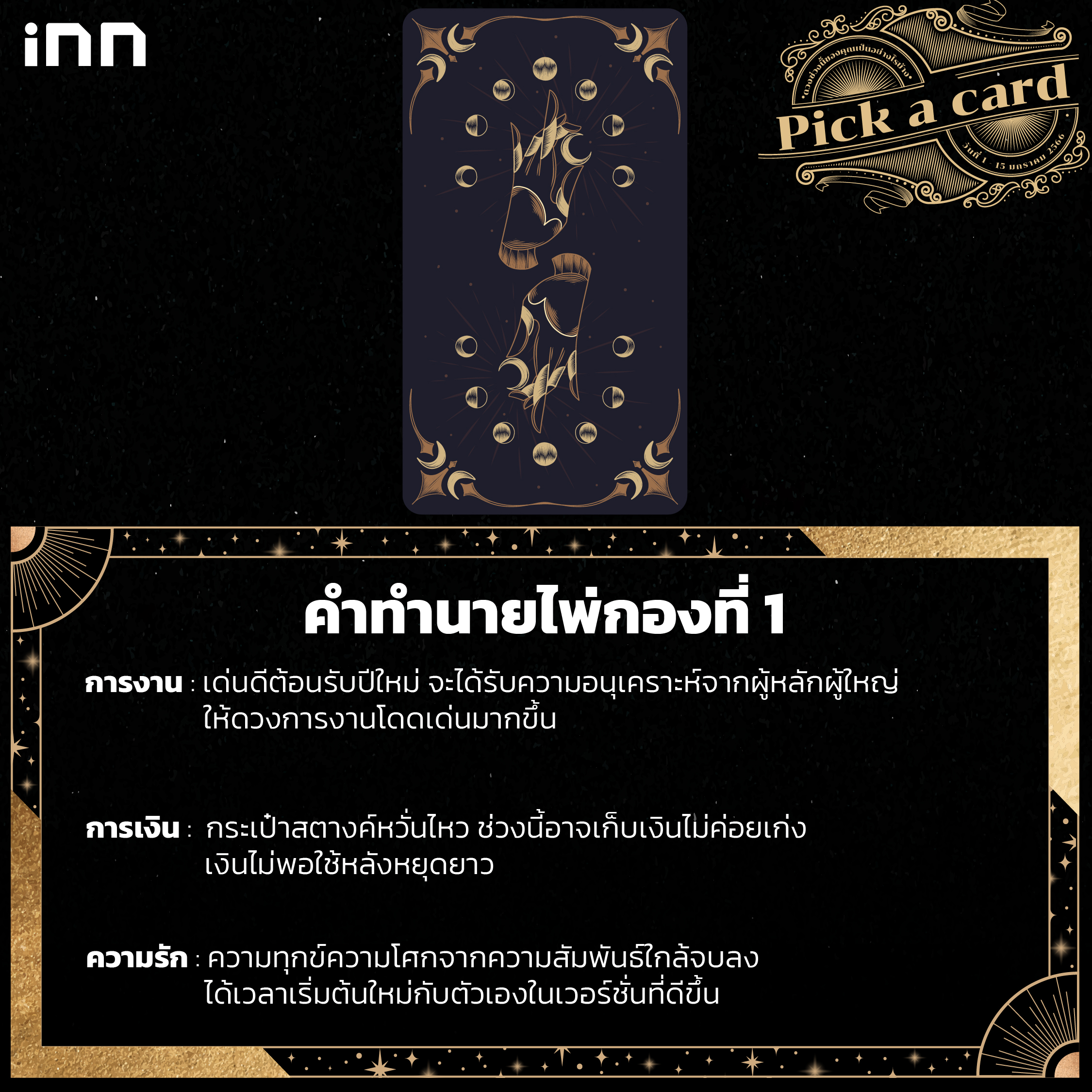 ไม่ว่าจะหยิบหรือเลือกกองไหน สำคัญที่สุดคือเตือนตัวเอง มีสติกับการใช้ชีวิต เพื่อที่จะผ่านเรื่องราวต่างๆ ในช่วงนี้ ถ้าใครที่มีความชอบในการอ่านดวง อยากเสริมดวง เสริมโชคลาภในรูปแบบอื่นๆ สามารถติดตามได้ที่นี่ iNN Horoscope