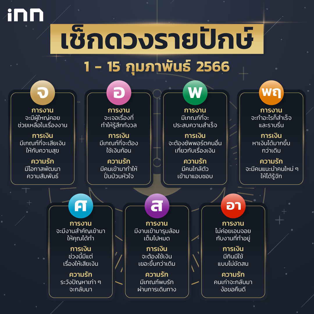 วันนี้ทีม iNN จะพาทุกคนมาอัปเดตดวงรายปักษ์ในช่วงครึ่งเดือนแรกระหว่างวันที่ 1 – 15 กุมภาพันธ์ 2566 ไม่ว่าจะเป็นเรื่องดวงการงาน ดวงการเงิน หรือ ดวงความรัก ว่าแต่ดวงชะตาของแต่ละวันเกิดนั้นจะเป็นอย่างไรบ้าง มาอ่านกันเลย!