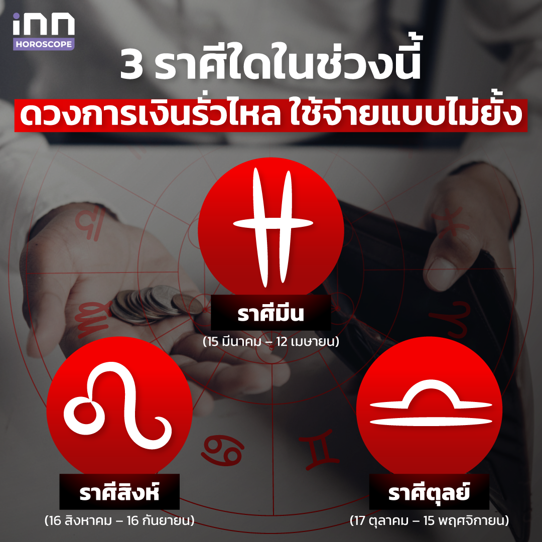 และนี่ก็คือ 3 ราศีที่ในช่วงนี้ ดวงการเงินรั่วไหล ใช้จ่ายแบบไม่ยั้ง และถ้าใครที่มีความชอบในการอ่านดวง ดูดวงความรัก ดูดวงการงาน ดูดวงการเงิน อยากเสริมดวง เสริมโชคลาภในรูปแบบอื่นๆ สามารถติดตามได้ที่นี่ iNN Horoscope
