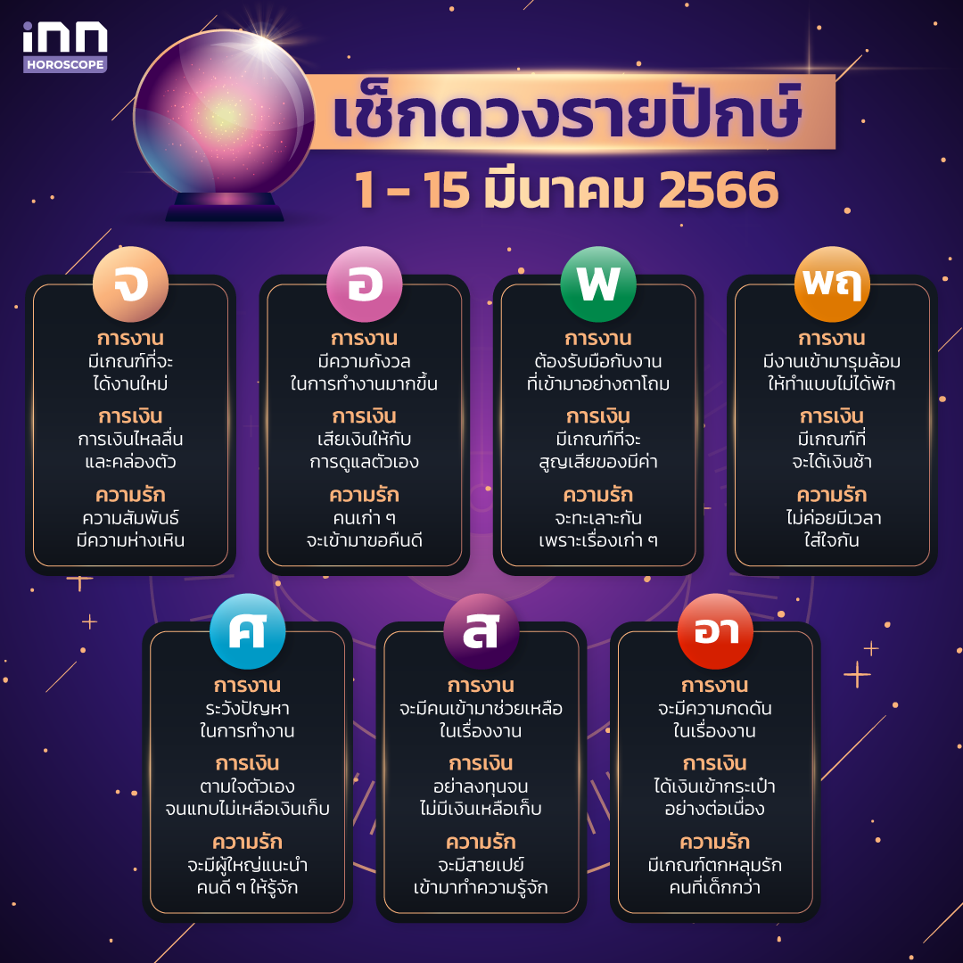 วันนี้ทีม iNN จะพาทุกคนมาอัปเดตดวงรายปักษ์ในช่วงครึ่งเดือนแรกระหว่างวันที่ 1 – 15 มีนาคม 2566 ไม่ว่าจะเป็นเรื่องดวงการงาน ดวงการเงิน หรือดวงความรัก ว่าแต่ดวงชะตาของแต่ละวันเกิดนั้นจะเป็นอย่างไรบ้าง มาอ่านกันเลย!