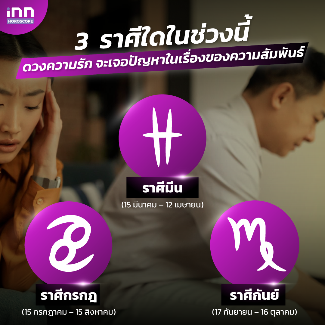 มีใครที่อยู่ในความสัมพันธ์ที่สามวันดีสี่วันไข้ เดี๋ยวทุกข์เดี๋ยวสุข ไม่รู้ว่าจะต้องรู้สึกยังไงอยู่บ้าง วันนี้ทีม iNN จะมาเตือน สำหรับ 3 ราศีใดในช่วงนี้ ดวงความรัก จะเจอปัญหาในเรื่องของความสัมพันธ์ ไปเช็กกันเลย