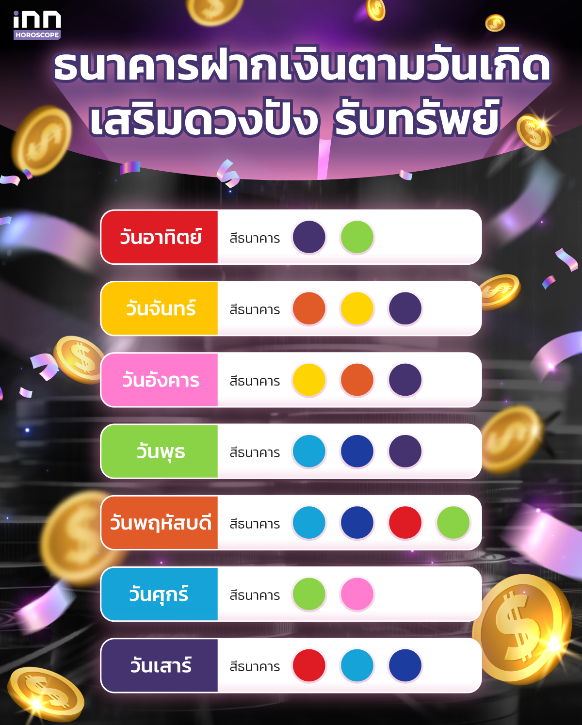 สีธนาคารเสริมดวงการเงิน : ธนาคารสีเหลือง ช่วยเสริมดวงการเงิน เพิ่มโชคลาภ, ธนาคารสีม่วง ช่วยให้มีเงินทองใช้จ่ายไม่ขาดมือ