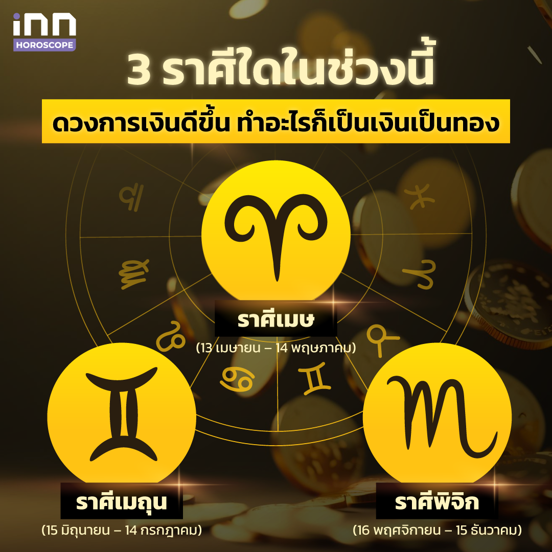มีใครกำลังรอฟังข่าวดีในเรื่องของ ดวงการเงิน อยู่บ้าง? วันนี้ทีม iNN จะมาบอกข่าวดี สำหรับ 3 ราศีใดที่ในช่วงนี้  ดวงการเงินดีขึ้น ทำอะไรก็เป็นเงินเป็นทอง ว่าแต่จะมีราศีของคุณรวมอยู่ด้วยไหม ไปอ่านกันเลย