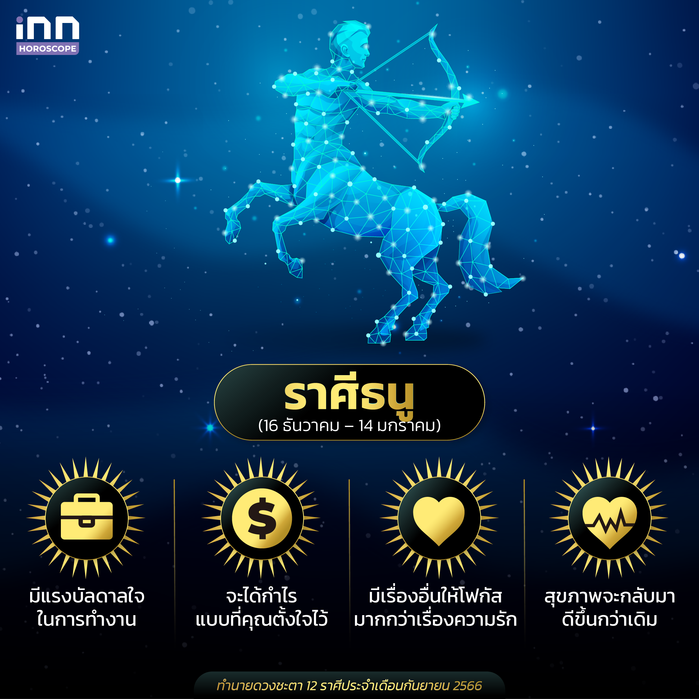 ดวงการงานของชาวราศีธนูในเดือนนี้จะมีความไฟแรงมากขึ้น คุณจะหาแรงบัลดาลใจในการทำงานได้ดีกว่าเดิม สำหรับใครที่ต้องไปทำงานเกี่ยวกับการเจรจาหรือต้องไปพูดคุยงานที่สำคัญ เร็วๆนี้คุณมีเกณฑ์ที่จะประสบความสำเร็จ