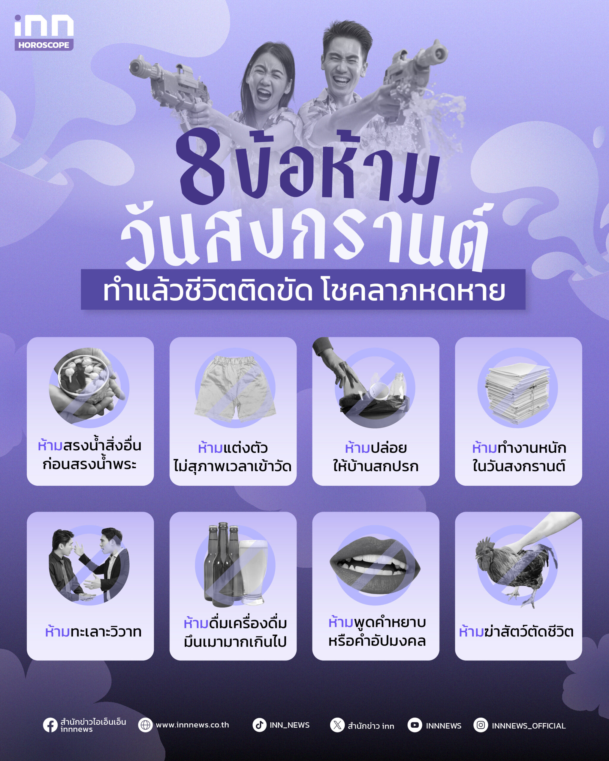 จะเห็นได้ว่า 8 ข้อห้ามวันสงกรานต์ ที่กล่าวมานี้ ล้วนมีรากฐานมาจากทั้งความเชื่อโบราณและเหตุผลทางหลักความเป็นจริง การเริ่มต้นปีใหม่ไทยด้วยสิ่งดี ๆ ไม่เพียงช่วยเสริมสิริมงคลให้ตัวเอง แต่ยังส่งต่อพลังงานบวกไปยังคนรอบข้างอีกด้วย