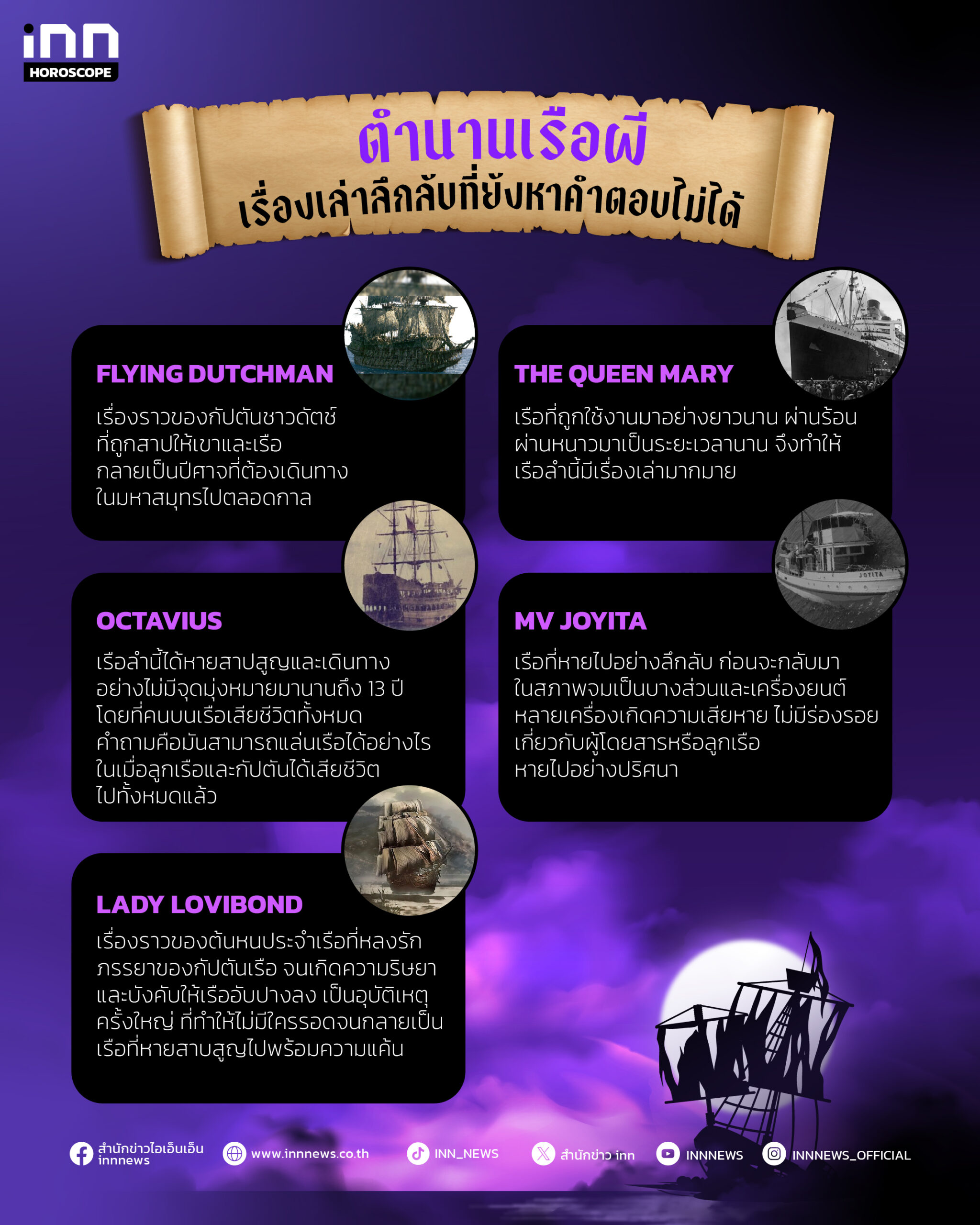 ทะเลคือพื้นที่ที่ยังคงเก็บงำความลึกลับมากมายไว้ใต้ผืนน้ำ ตำนานเรือผี และเรื่องราวลึกลับในทะเล ล้วนเป็นปริศนา แม้ว่าจะไม่สามารถพิสูจน์ได้ แต่เรื่องเล่าและตำนานเหล่านี้ก็จะถูกเล่าขาน เพื่อเตือนใจให้เราระลึกถึงพลังของสิ่งที่มนุษย์ไม่อาจควบคุมได้ต่อไป
