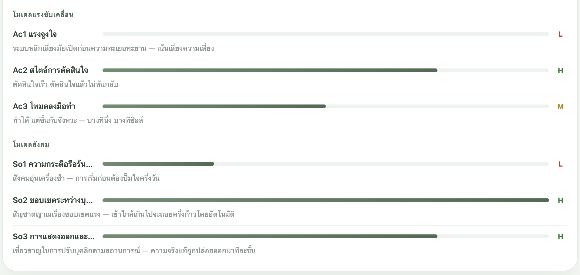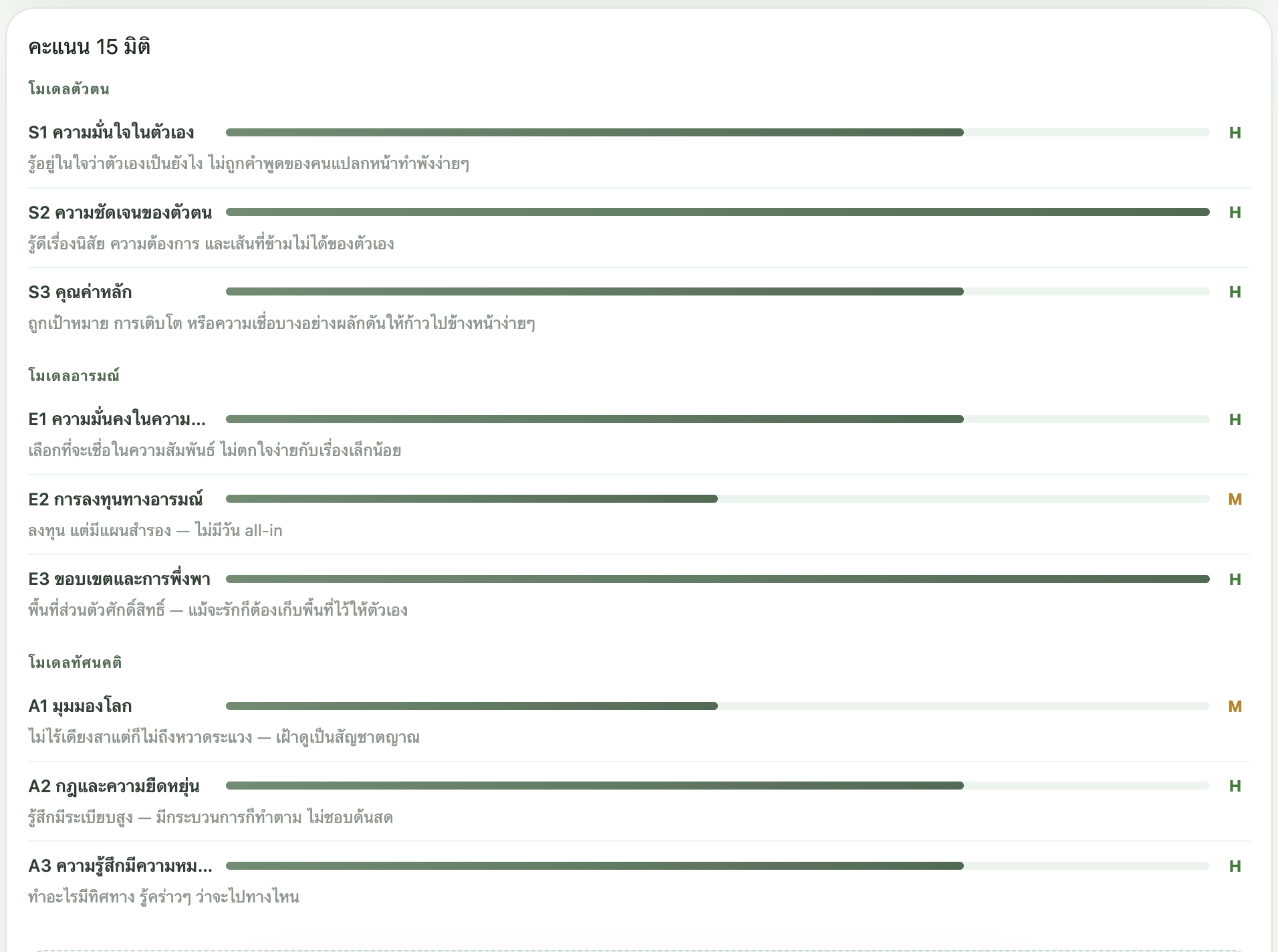 5. เลื่อนลงมาอีกหน่อย มีรายละเอียดให้ดูด้วยนะ ว่าโมเดลตัวตนของเราในแต่ละหัวข้อเป็นยังไง ได้คะแนนมากน้อยแค่ไหน