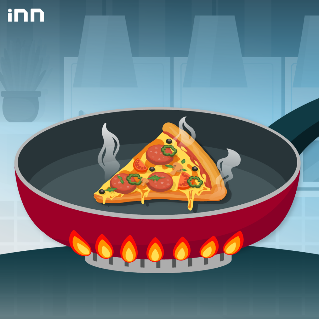 2.อุ่นพิซซ่าค้างคืนในกระทะ จะได้พิซซ่าขอบกรอบ