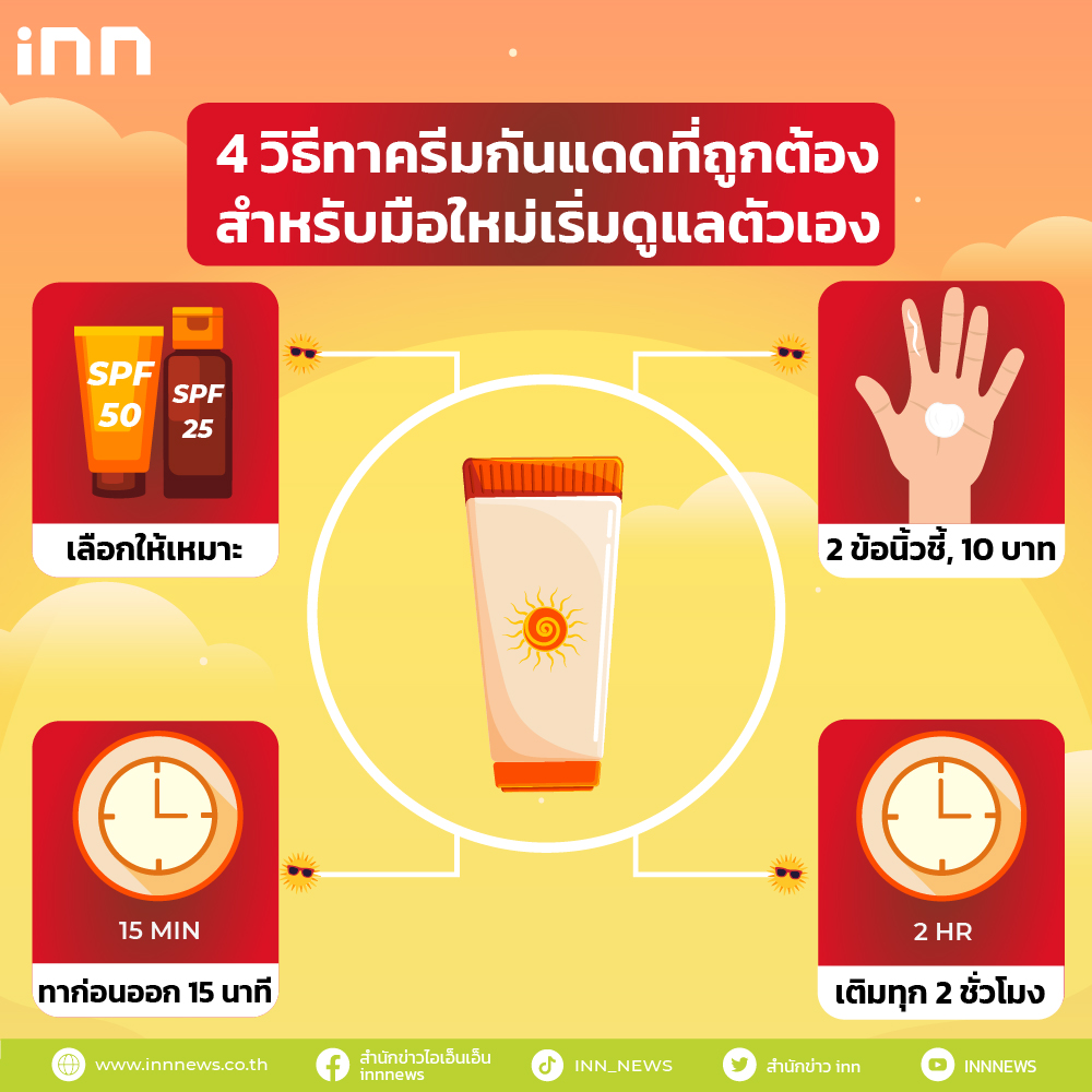 และนี่คือ 4 เทคนิคการทาครีมกันแดดที่เราเอามาฝากกัน เพราะบ้านเราเป็นเมืองร้อนแดดก็เปรี้ยงปร้างสว่างไสว อย่าลืมใช้กันแดดให้ถูกต้องและมีวินัยอย่างสม่ำเสมอด้วยล่ะ จะได้ไม่ต้องเสียใจว่าทาแล้วทำไมผิวยังไม่ดีขึ้นสักที ติดตามบทความสุขภาพดีๆ หรือ ไลฟ์สไตล์โดนๆได้ที่ iNN Lifestyle