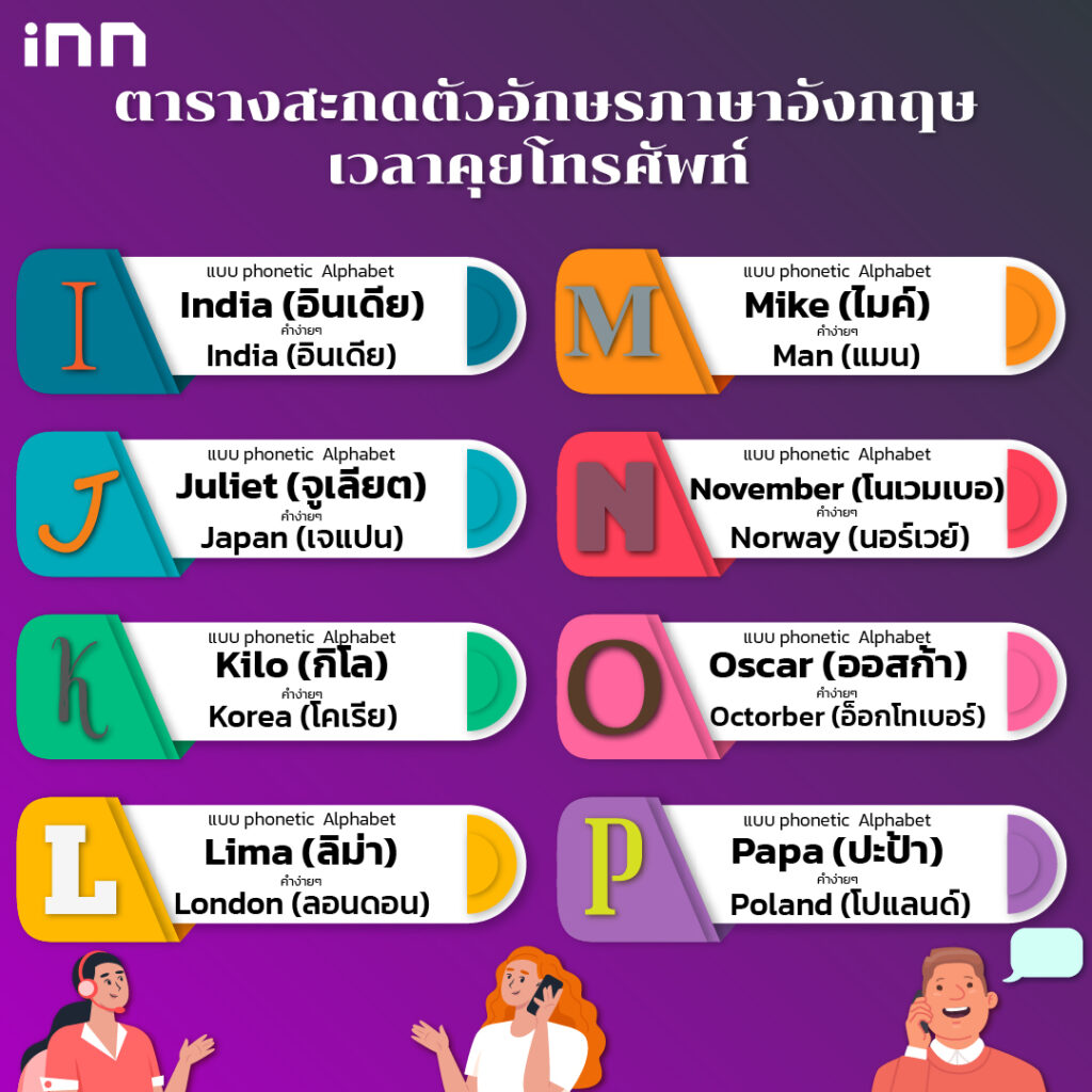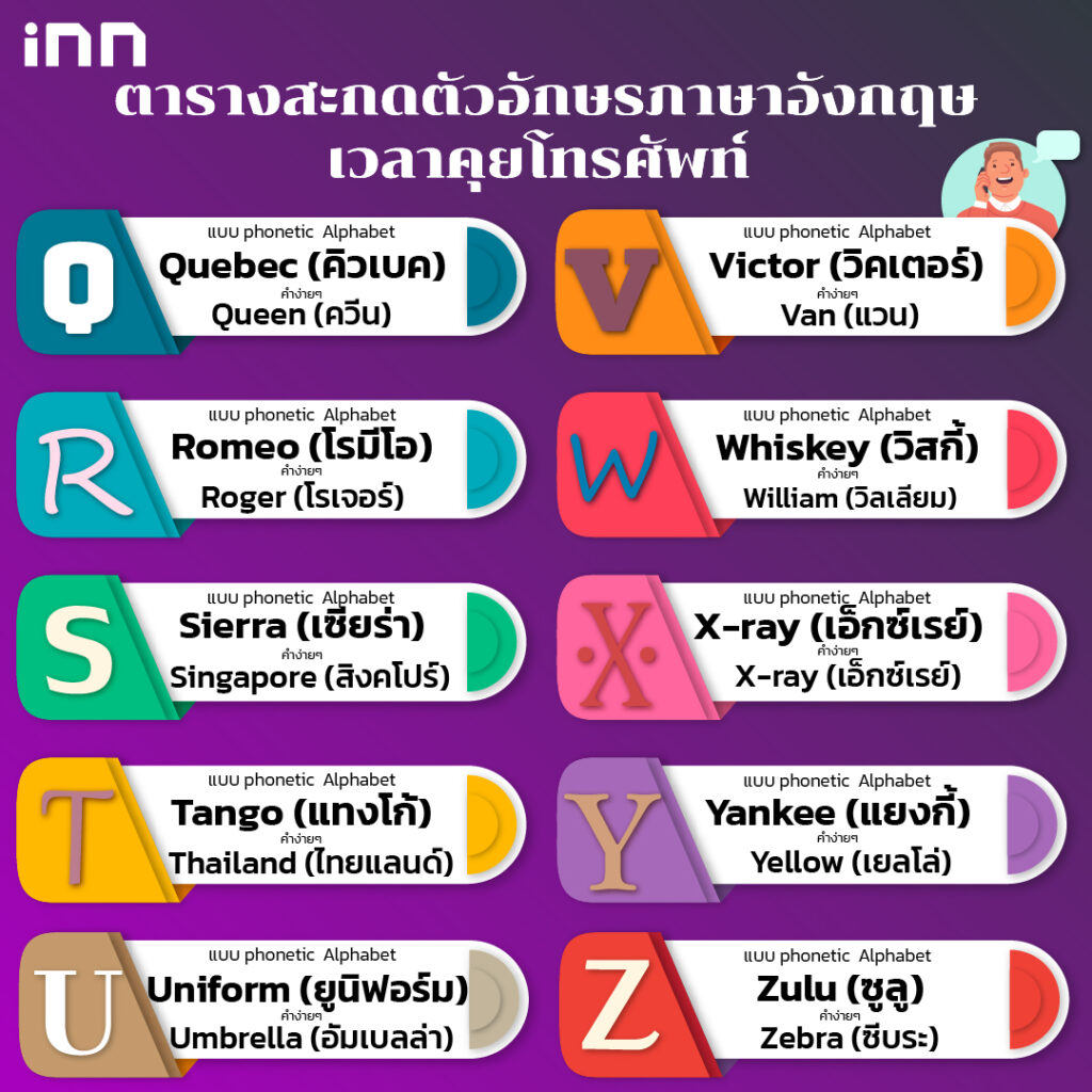 เซฟเก็บไว้ได้เลยไว้สะกดตามตารางนี้ วิธีใช้ก็ไล่สะกดไปทีละตัวเช่น เราชื่อ น้ำ Nam เวลาพูดก็ N-Norway A-Alpha M-Man แค่นี้ก็ทำให้การสะกดชื่อทางโทรศัพท์ง่ายขึ้นอีกเยอะ ไหนใครเคยเจอคำอะไรแปลกๆ บ้างไหม เล่าให้ ไอ.เอ็น.เอ็น. ฟังหน่อยน้า