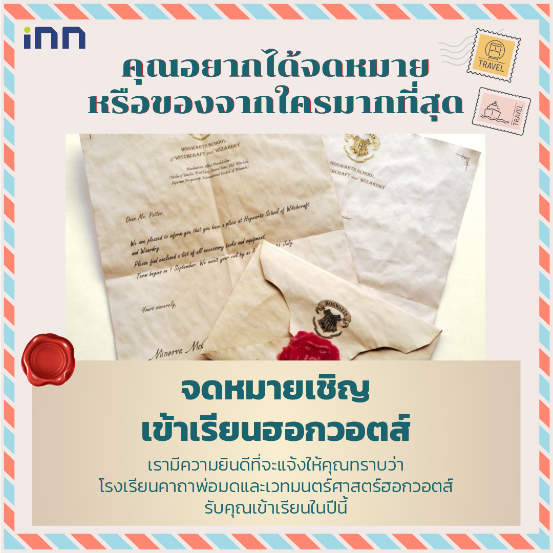 เรามีความยินดีที่จะแจ้งให้คุณทราบว่าโรงเรียนคาถาพ่อมดและเวทมนตร์ศาสตร์ฮอกวอตส์ รับคุณเข้าเรียนในปีนี้ จดหมายที่เด็กๆ ทุกคนอยากได้ทั่วโลก กับจดหมายเชิญเข้าเรียนที่ฮอกวอตส์ ที่จะมาพร้อมกับรายชื่อของที่เด็กปีหนึ่งต้องมี